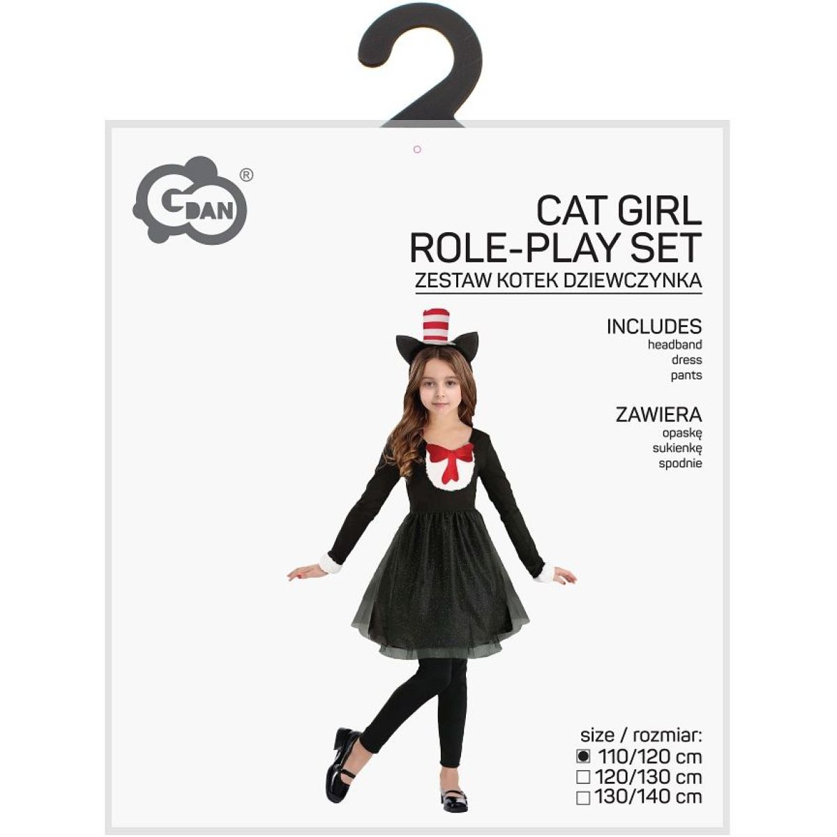 Šaty jsou ozdobeny třpytivou černou sukní z lehkého tylu, jež vytváří jemný objem a pohádkový efekt. Rukávy jsou zakončeny bílými manžetami ladícími s límcem, čímž je zachován jednotný design. Součástí kostýmu jsou také černé legíny, které zajišťují komfort při nošení a umožňují použití kostýmu i v chladnějším počasí. Set doplňuje čelenka s kočičími oušky z měkkého materiálu, která pohodlně sedí na hlavě. Kostým je vyroben z lehkých a příjemných materiálů a je vhodný pro děti s výškou 130 až 140 cm.