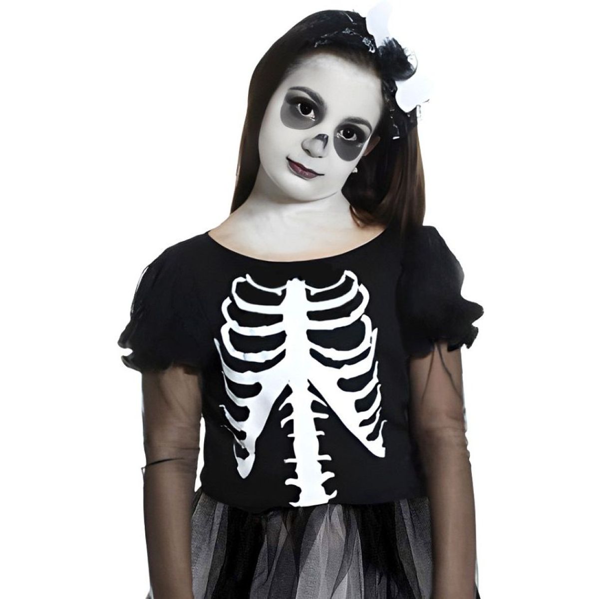 Kostým Kostlivec holčičí ve velikosti 110–120 cm je určen pro děti na karneval, Halloween, tematické oslavy i školní akce. Jednodílné šaty v tmavém provedení s kontrastním bílým potiskem vytvářejí výrazný kosterní motiv a zajišťují okamžitě rozpoznatelný vzhled kostlivce.