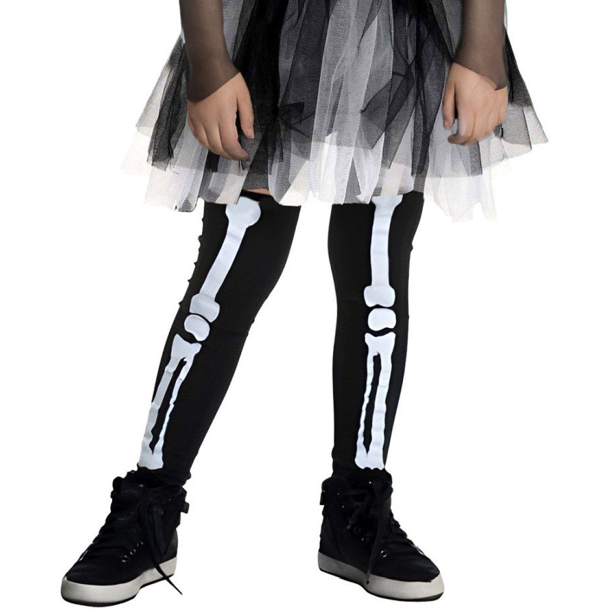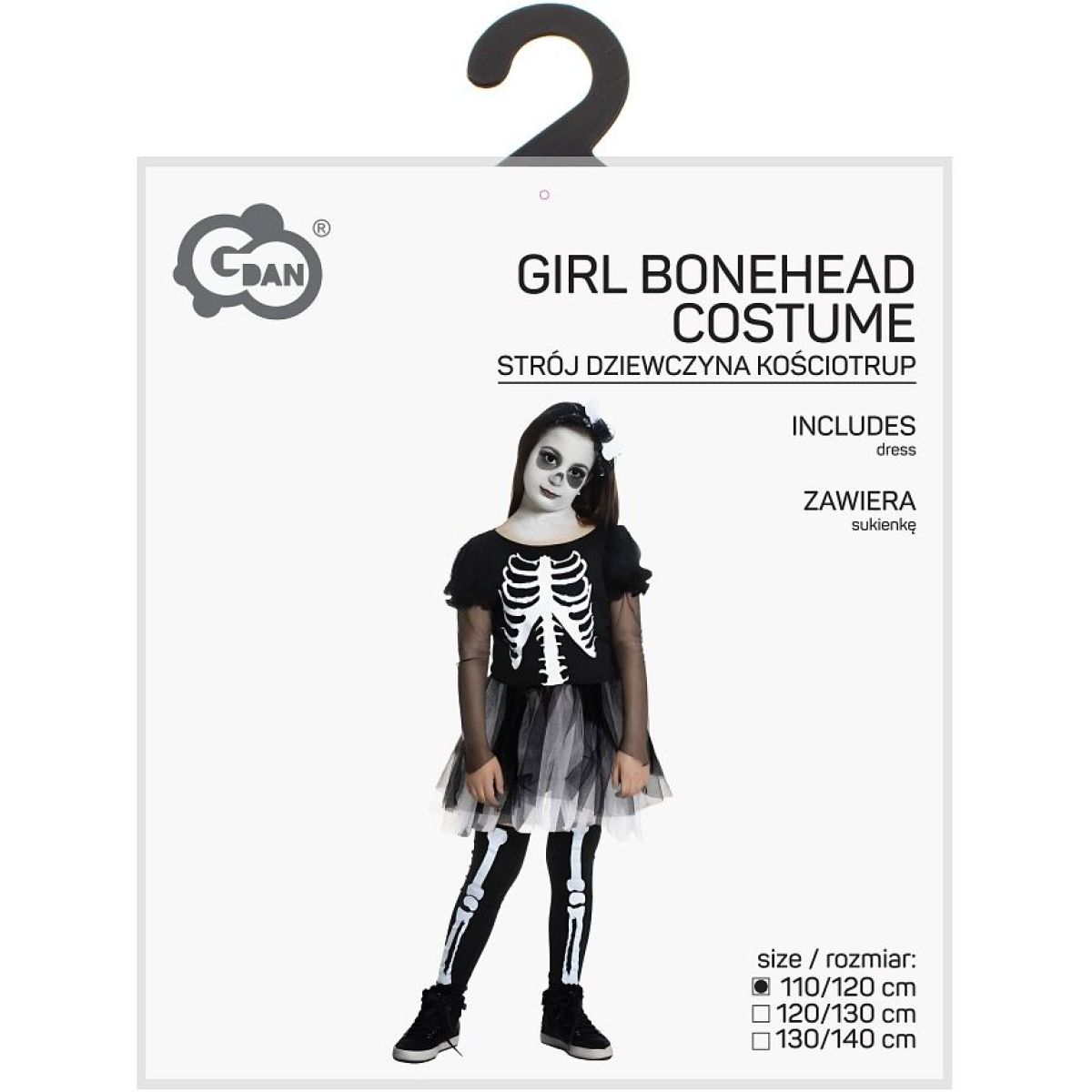 Kostým obsahuje pouze šaty. Doplňky z fotografií, jako legíny s potiskem kostí nebo vlasová stuha s mašlí, nejsou součástí balení a lze je snadno dokoupit či nahradit vlastními. Díky pohodlnému střihu je kostým vhodný pro delší nošení během oslav i her.