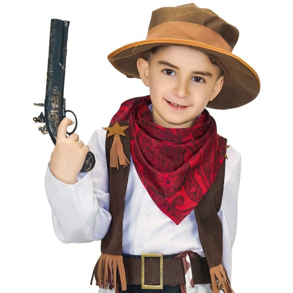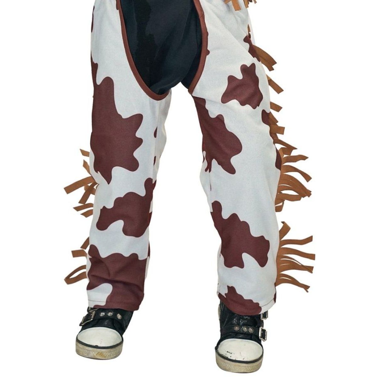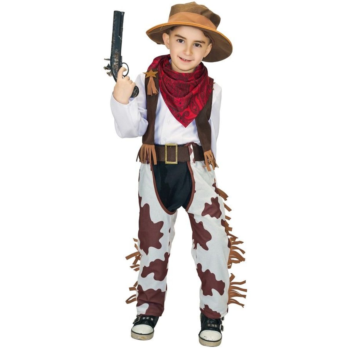 Součástí kostýmu jsou kalhoty v bílé barvě s hnědými skvrnami imitujícími kravskou kůži, doplněné o třásně po stranách, tmavě hnědá vesta se stejnými třásněmi, kovbojský klobouk, opasek s výraznou zlatou přezkou a červený šátek s tradičním vzorem. Na vestě je umístěna zlatá kovbojská hvězda, která dotváří autentický vzhled kostýmu. Kostým je vhodný pro opakované použití při karnevalech a tematických akcích.