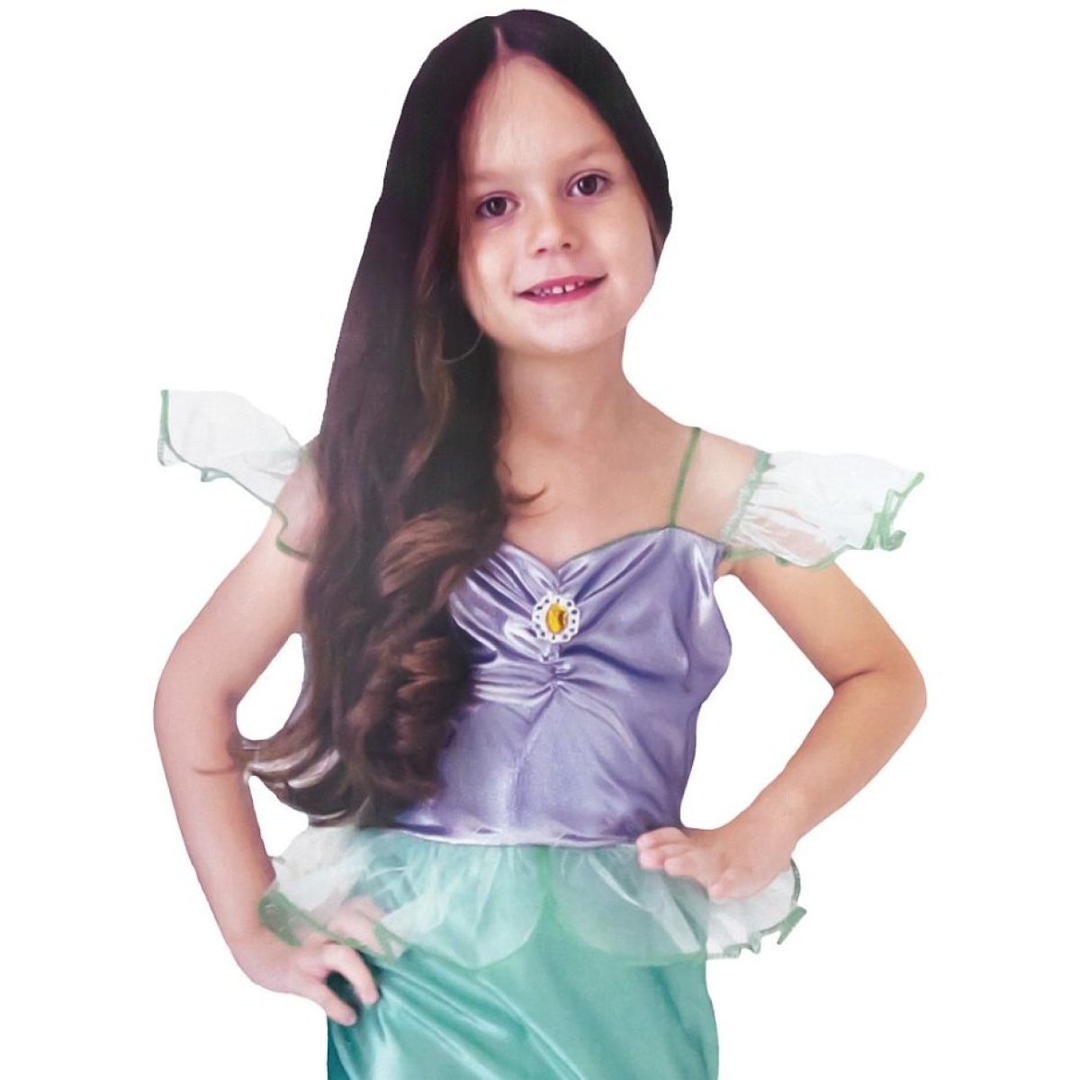 Dětský kostým Mořská víla zelený ve velikosti 110–120 cm je určen pro karnevaly, tematické oslavy a pohádkové hry s podmořskou tematikou. Kostým tvoří jedny šaty navržené tak, aby věrně evokovaly vzhled mořské víly. Horní část šatů je v jemné fialové barvě s lesklým efektem připomínajícím perly a podmořské poklady. Na přední straně se nachází dekorativní ozdoba ve tvaru kamínku, která dodává kostýmu výrazný detail.