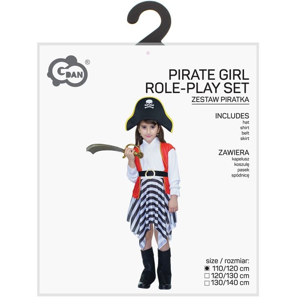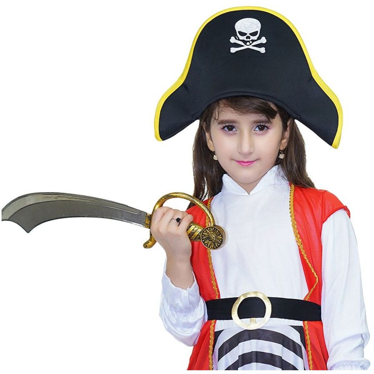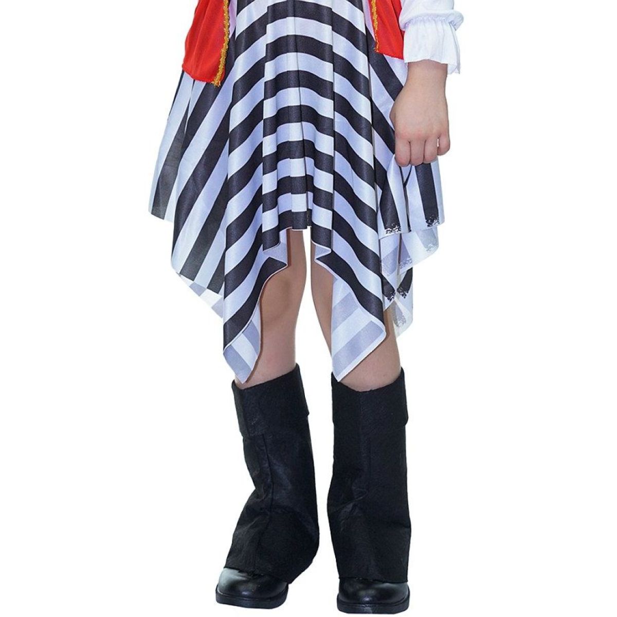Součástí je černý klobouk se žlutým lemováním a motivem lebky se zkříženými kostmi, bílá halenka s dlouhými rukávy zakončenými volánky, červená vesta se zlatým lemem, pruhovaná asymetrická sukně, černý pásek se zlatou přezkou a černé návleky na boty imitující vysoké pirátské holínky. Střih kostýmu je přizpůsoben dětským proporcím a umožňuje volný pohyb při hrách. Použité materiály jsou lehké, pohodlné a vhodné pro opakované použití.