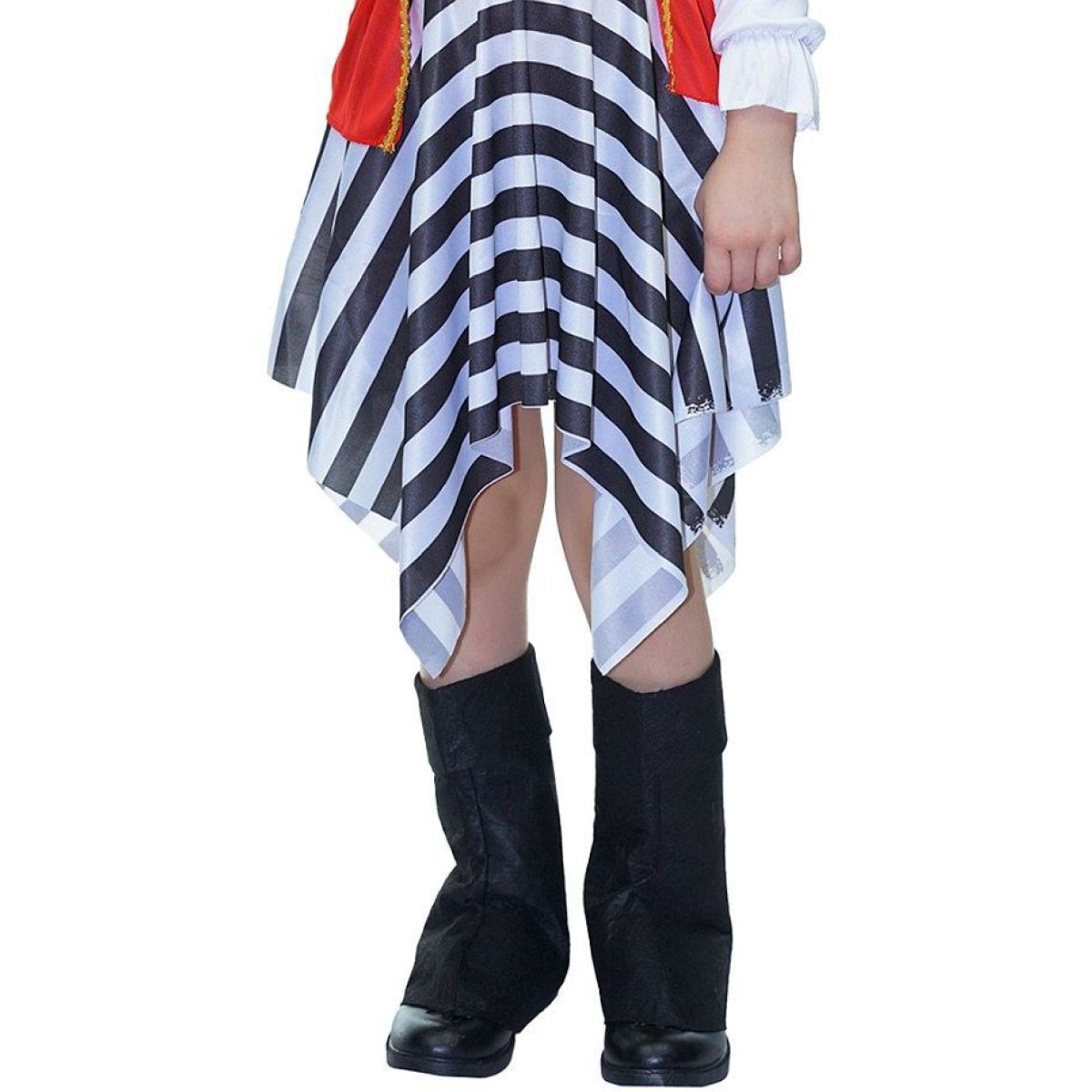Kostým doplňuje černý pásek s výraznou zlatou kulatou přezkou, který zvýrazňuje pas. Součástí balení je také černý pirátský klobouk se žlutým lemováním a motivem lebky s hnáty, jenž dobře drží tvar a dotváří celkový vzhled. Černé návleky na boty imitují vysoké pirátské boty a zajišťují ucelený dojem. Použité materiály jsou lehké a pohodlné, vhodné pro delší nošení.