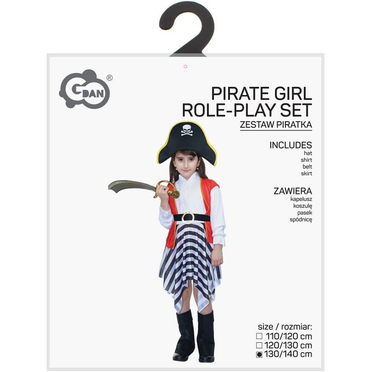 Součástí kostýmu je bílá halenka s dlouhými rukávy z hladkého materiálu, která je doplněna jemným řasením pro historický efekt. Červená vesta se zlatým lemováním vytváří výrazný kontrast a dodává kostýmu tradiční pirátský charakter. Sukně s černo-bílými šikmými pruhy a nepravidelným zakončením evokuje typický pirátský styl a působí dynamicky při pohybu.