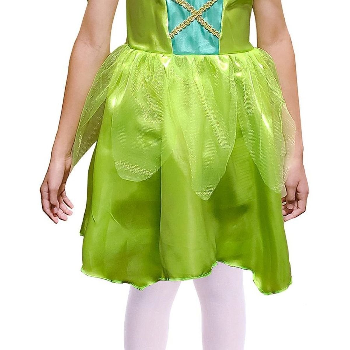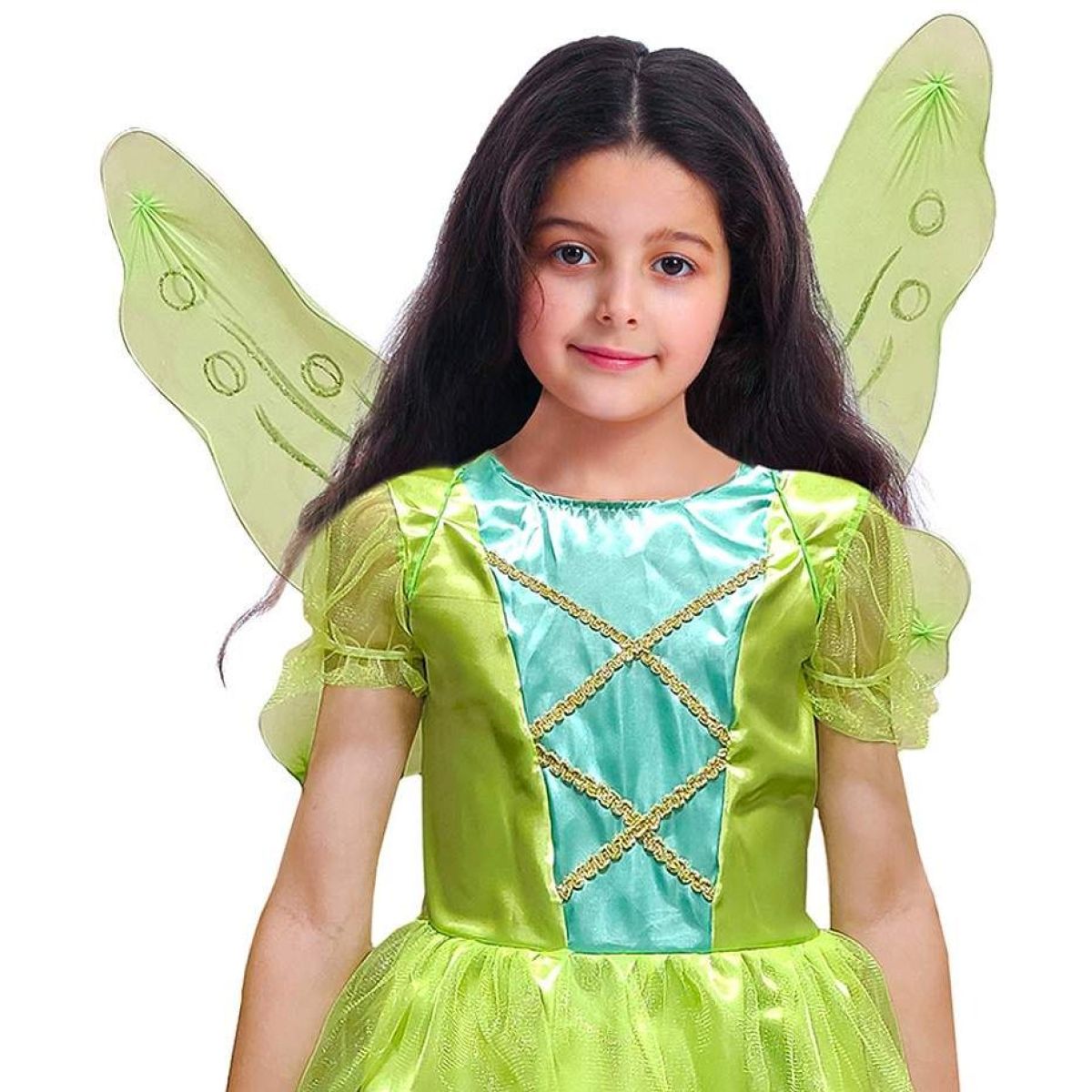 Krátké rukávy z průsvitné organzy působí vzdušně a lehce. Sukně je tvořena více vrstvami látky, včetně jemné síťoviny, která vytváří efekt listových okvětních lístků typických pro vílí motivy. Součástí kostýmu jsou také zelená průsvitná křídla s jemným zdobením v podobě linií a koleček. Křídla jsou lehká, pohodlná na nošení a zároveň dostatečně pevná, aby si zachovala tvar během pohybu. Kostým je přizpůsoben dětem s výškou 110 až 120 cm a poskytuje komfort při nošení i během delších her.