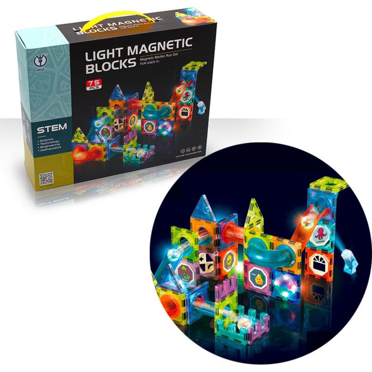 Kuličková dráha poskytne malým stavitelům spousty zábavy. Pořiďte magnetický set barevných kostek, které ve tmě svítí. Dráhu lze sestavit dle návodu.