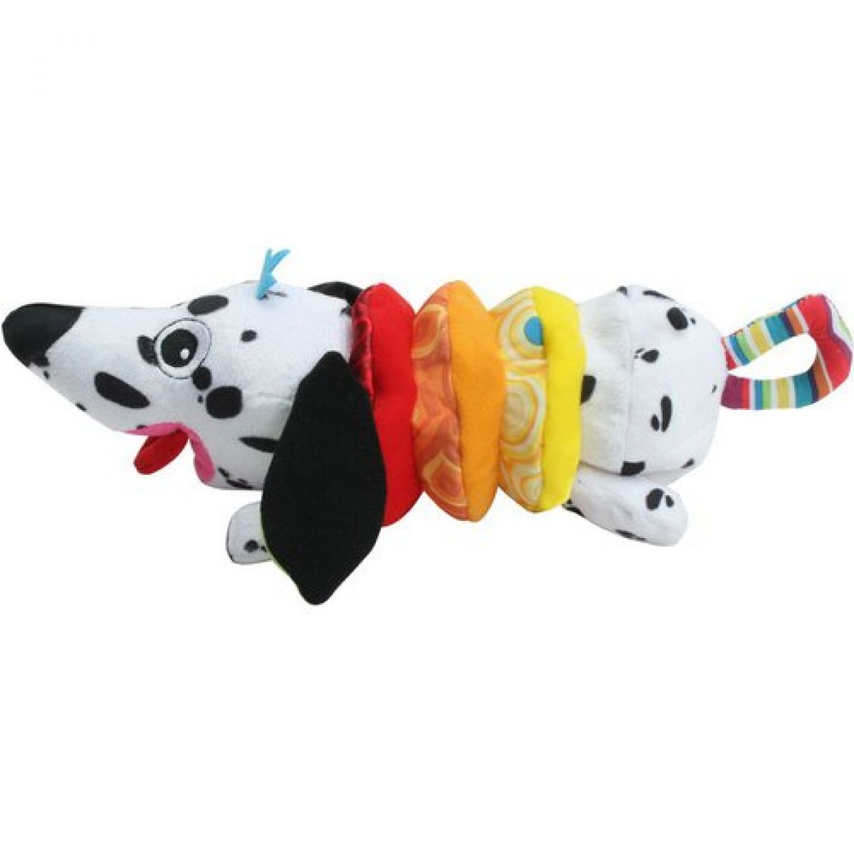 Bílý pejsek s typicky černými flíčky zaujme vaše miminko hned po narození. Díky výrazným kontrastům černé a bílé barvy dokáže hračka zaujmout novorozeně především v prvních třech měsících, kdy ještě nedokáže rozlišovat barvy. Dalmatin šustí, cinká a po zatahání za ocásek se natáhne a vibrováním své pestrobarevné tělíčko znovu smrskne.
