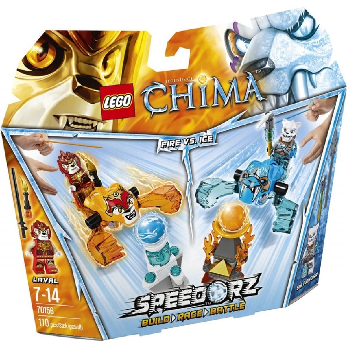 Připrav se na souboj mezi dobrem a zlem ve vysoké rychlosti, do kterého se pouští Laval proti Siru Fangarovi ve hře Souboj ohně a ledu od LEGO® Legends of Chima™ Speedorz™! Dej si zápas s kamarádem, vyber si vůdce některého kmene a nasaď svého vybraného bojovníka na jeho speedor. Namiř na věž s totemem CHI svého soupeře na vrcholku, zatáhni za natahovací lanko a uvolni energii. Vyhrává ten, kdo první srazí dolů kouli CHI! Vyzkoušej svou rychlost a pohotovost pomocí této zručnostní hry s natahovacím lankem pro 2 hráče.