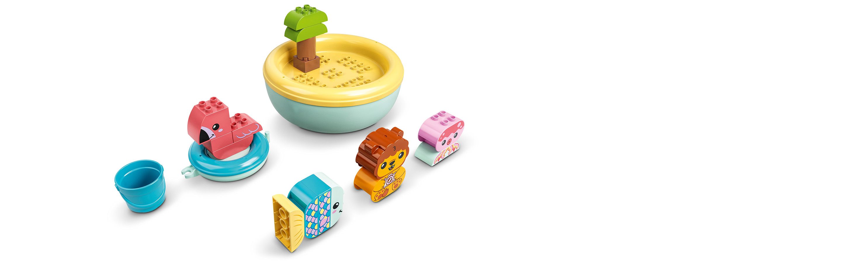 Ve stavebnici najdete rybu, chobotnici, lva a plameňáka. Plovoucí ostrov lze rozdělit na 2 části, které také plavou. Spodní část pak můžete použít i při hraní mimo vanu.