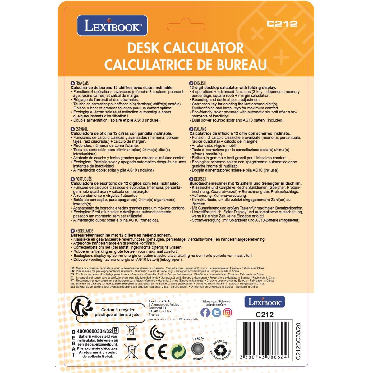Lexibook 12místná kapesní kalkulačka s nastavitelným úhlem obrazovky nabízí nejen moderní design, ale i praktickou funkčnost pro každodenní použití. Díky odolnému provedení a bezpečnému materiálu je ideální volbou pro děti od 3 let, které chtějí objevovat svět čísel a počítání zábavnou formou. Kalkulačka je vybavena knoflíkovou baterií LR54 (AG10), která je součástí balení, takže ji můžete ihned používat. Přenosná velikost a nastavitelnost úhlu obrazovky zaručují komfort při práci doma i na cestách.