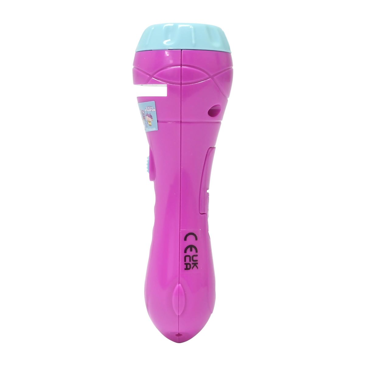 Plastové tělo v růžovo-modrém provedení je ergonomicky tvarované pro pohodlné držení. Jednoduchý posuvný spínač umožňuje snadné ovládání i pro menší děti a kompaktní rozměry usnadňují přenášení. Součástí balení jsou baterie pro okamžité použití.