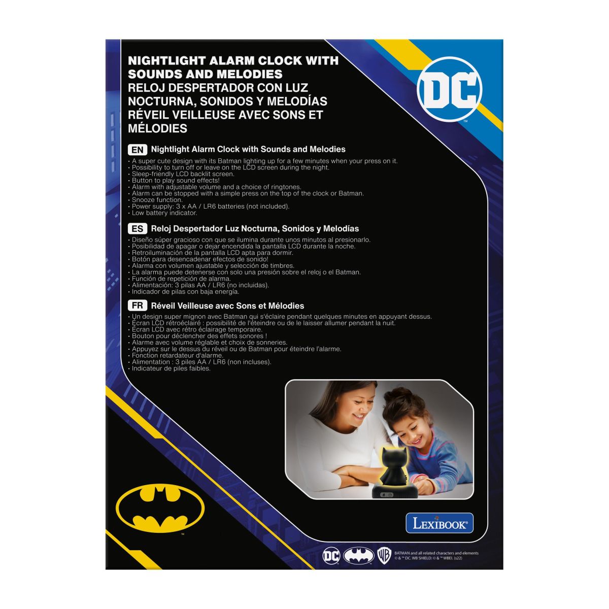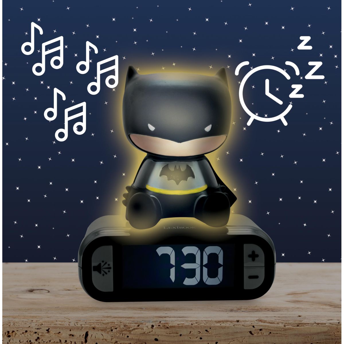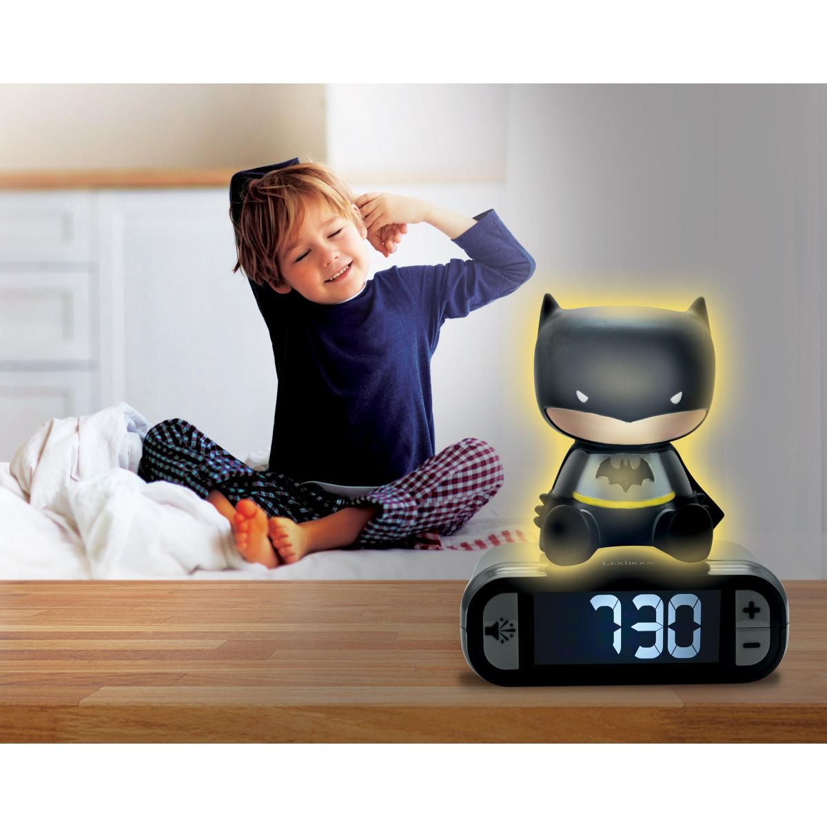 Zažijte každé ráno s dávkou superhrdinské energie díky budíku Lexibook Batman se svítící figurkou, který nejenže pomůže dětem vstávat, ale také ozdobí jejich pokoj unikátním světelným efektem.