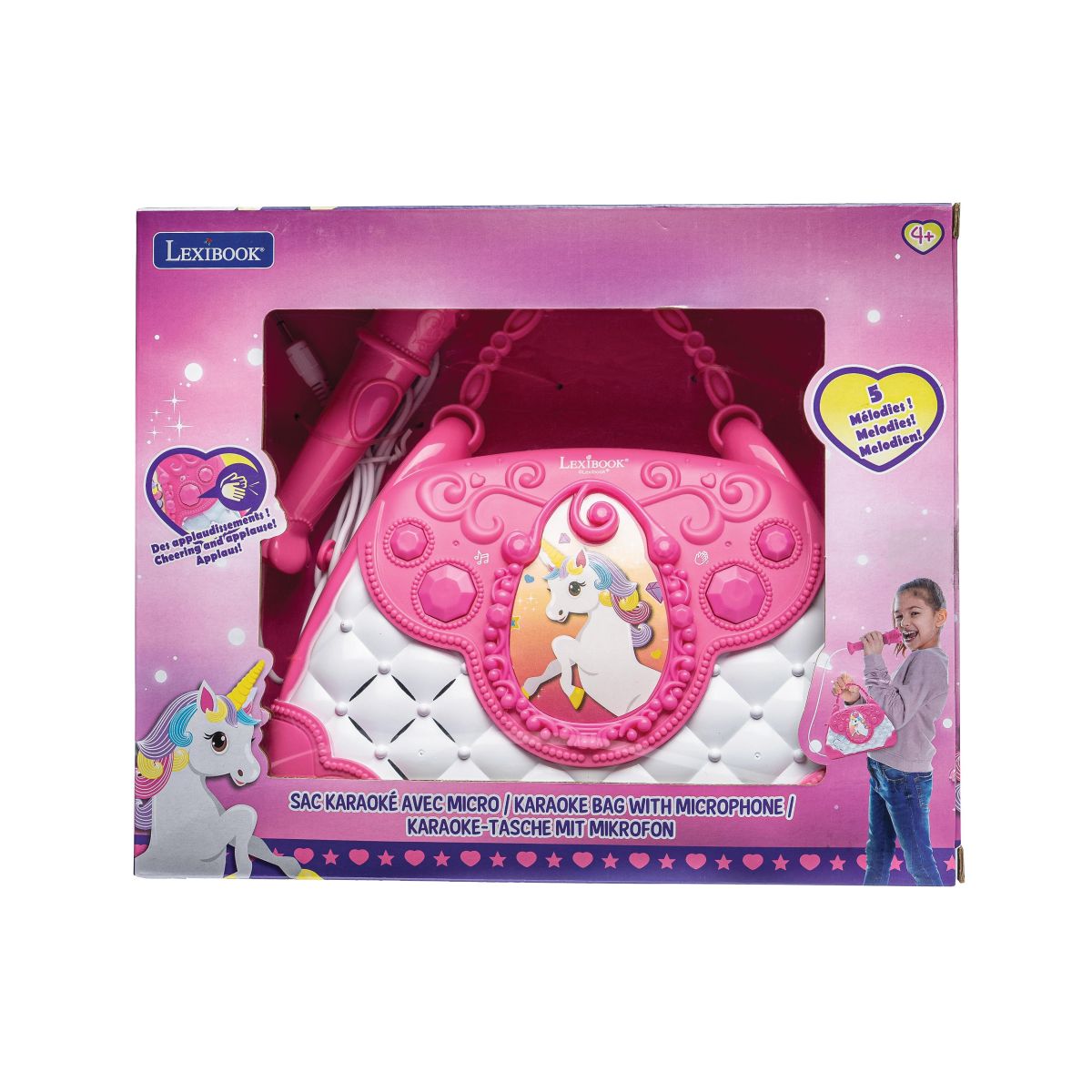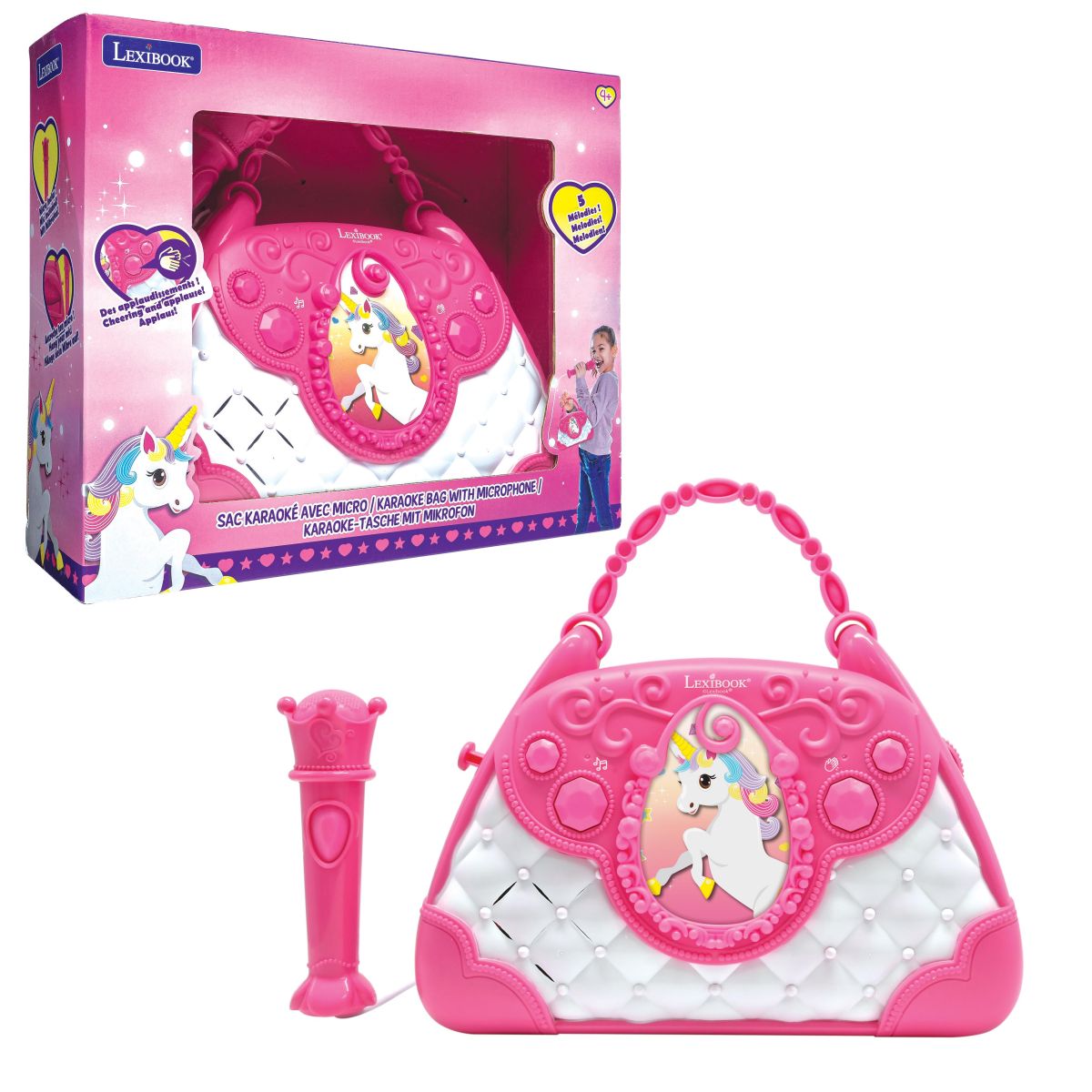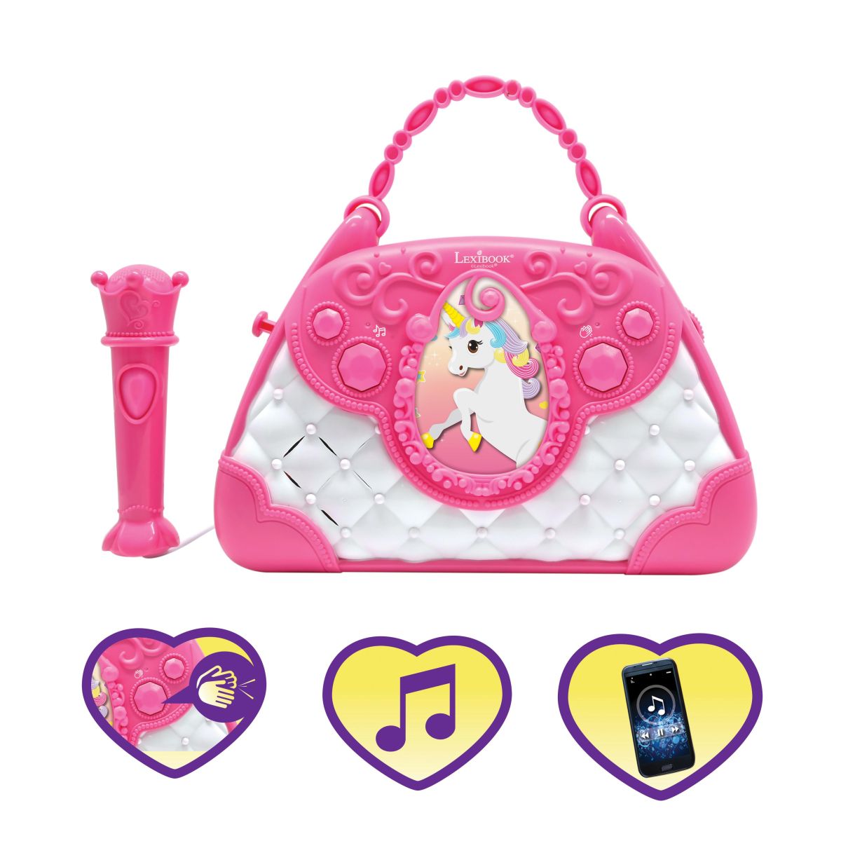Vstupte do světa hudební zábavy s Lexibook kabelkou Jednorožec, která kombinuje roztomilý design a dětské karaoke s mikrofonem a reproduktorem. Tato kabelka je ideální společník na doma i oslavy, kde podpoří nejen zpěv, ale i kreativitu a sebevědomí malých umělců.