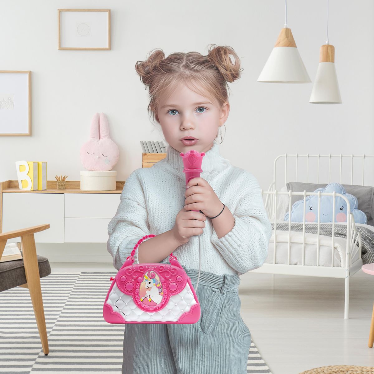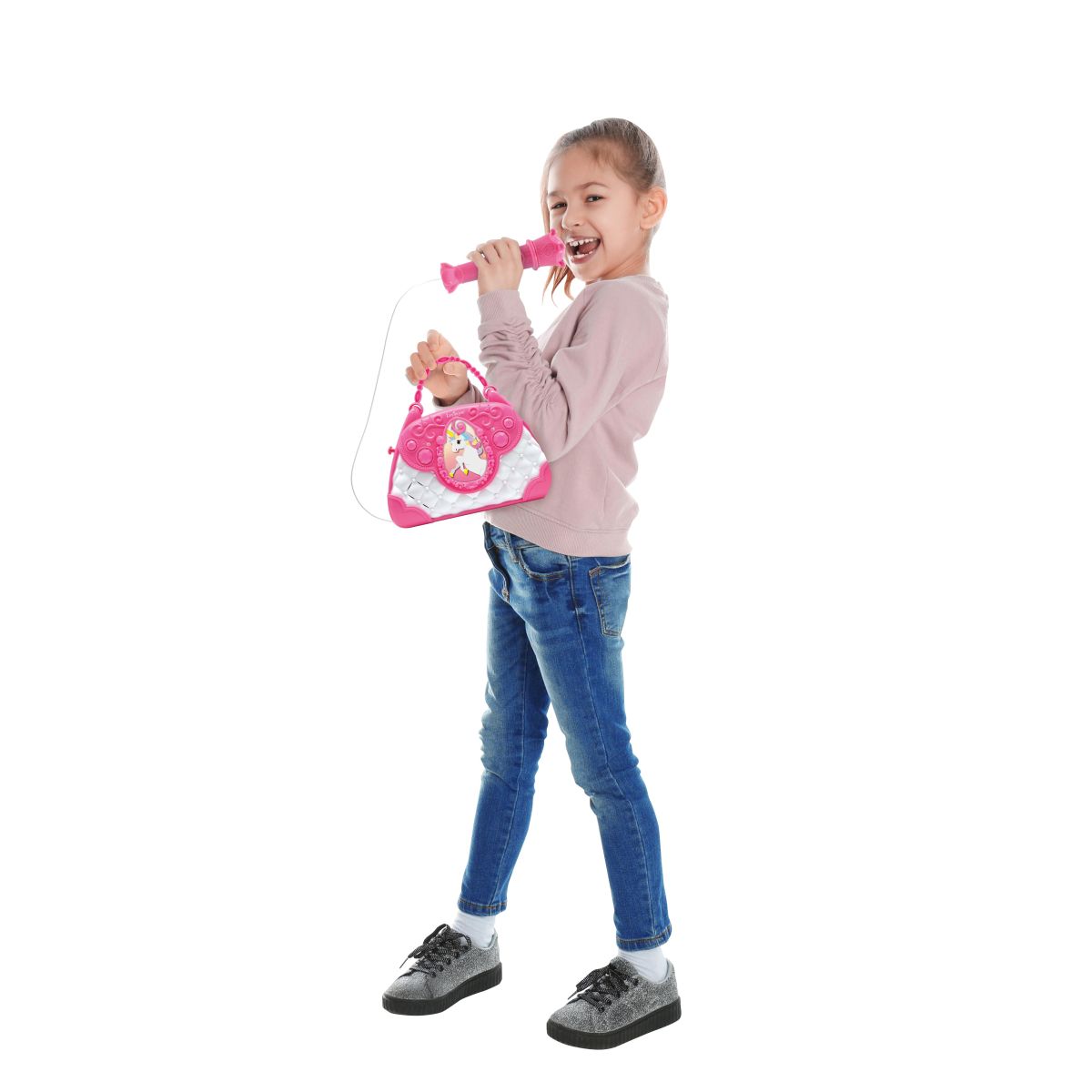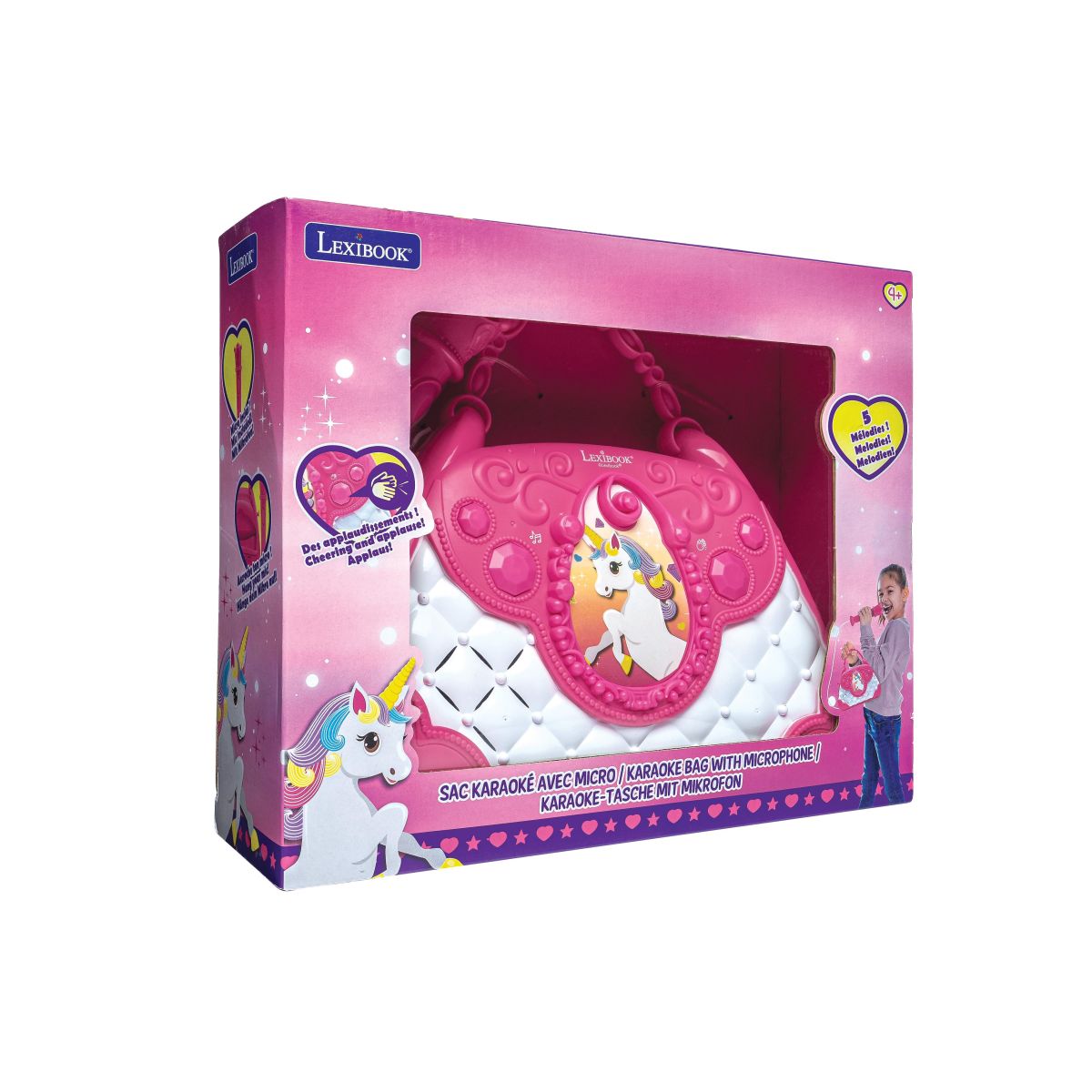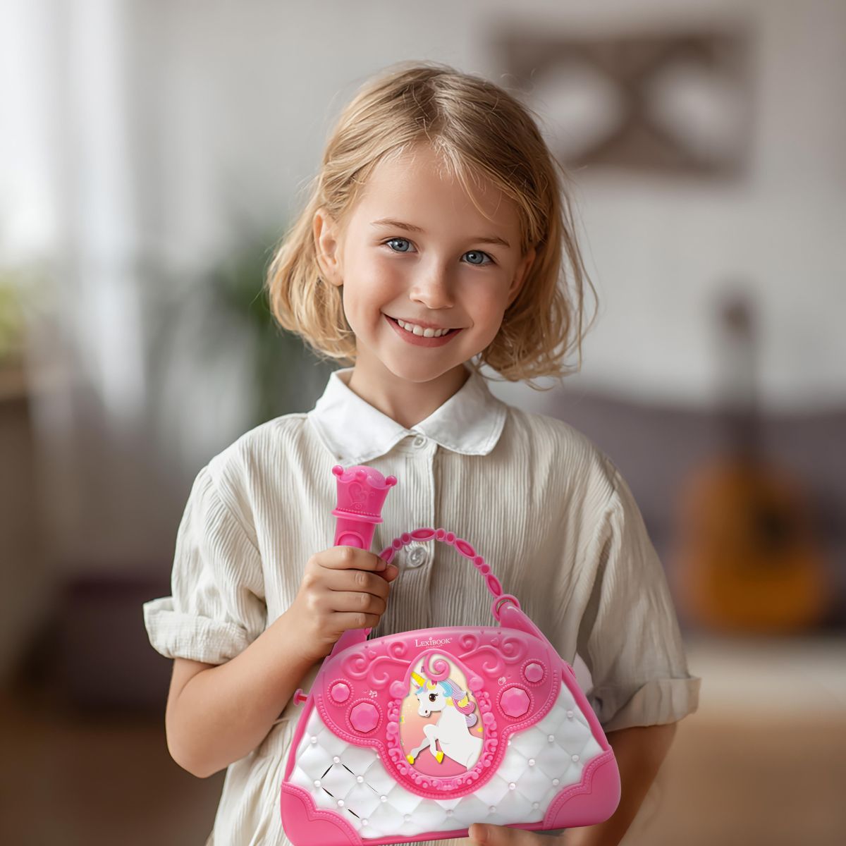 Vstupte do světa hudební zábavy s Lexibook kabelkou Jednorožec, která kombinuje roztomilý design a dětské karaoke s mikrofonem a reproduktorem. Tato kabelka je ideální společník na doma i oslavy, kde podpoří nejen zpěv, ale i kreativitu a sebevědomí malých umělců.