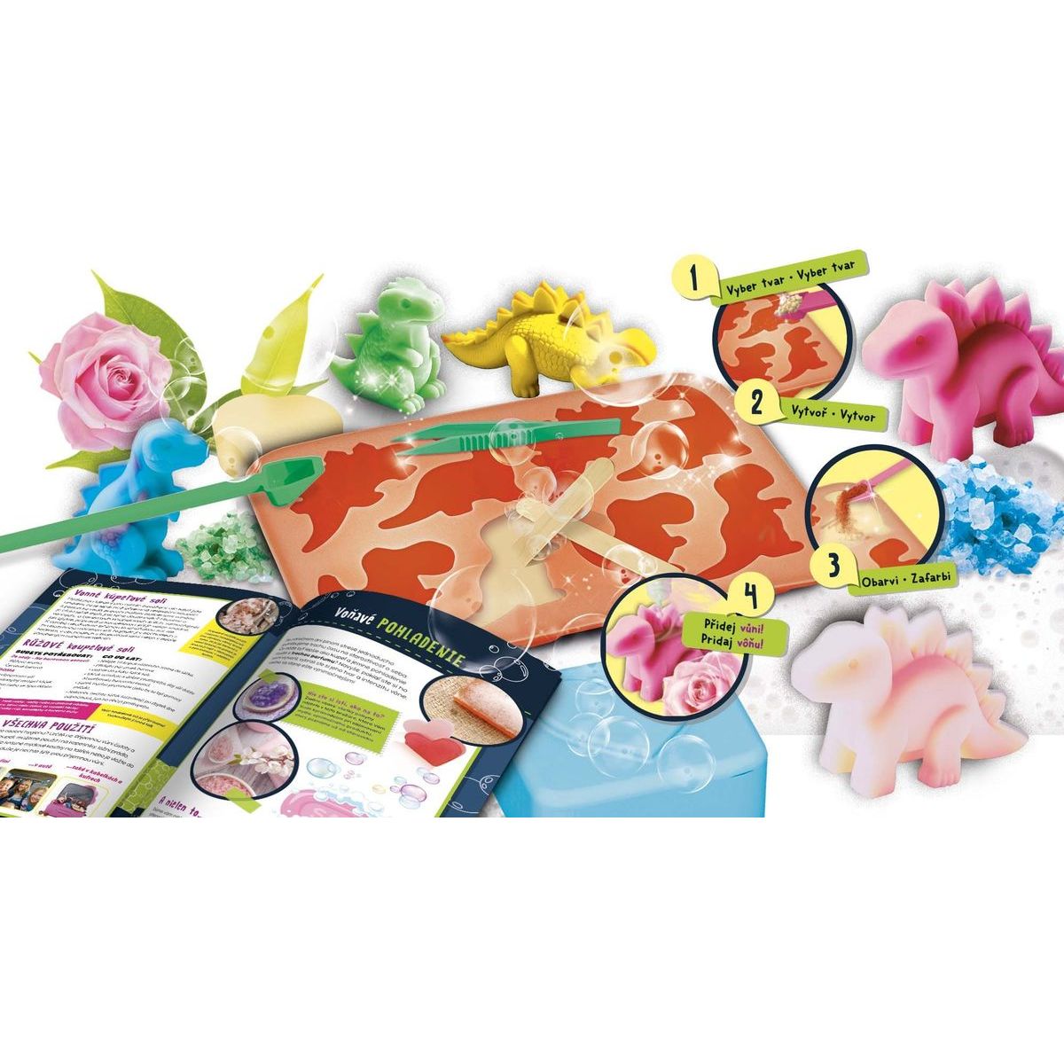 Kreatvní sada na výrobu mýdel. Sada obsahuje : formičky na mýdlo, barevnou esenci, vůni, glycerinové vločky, dřevěnou špachtli a odměrku.
