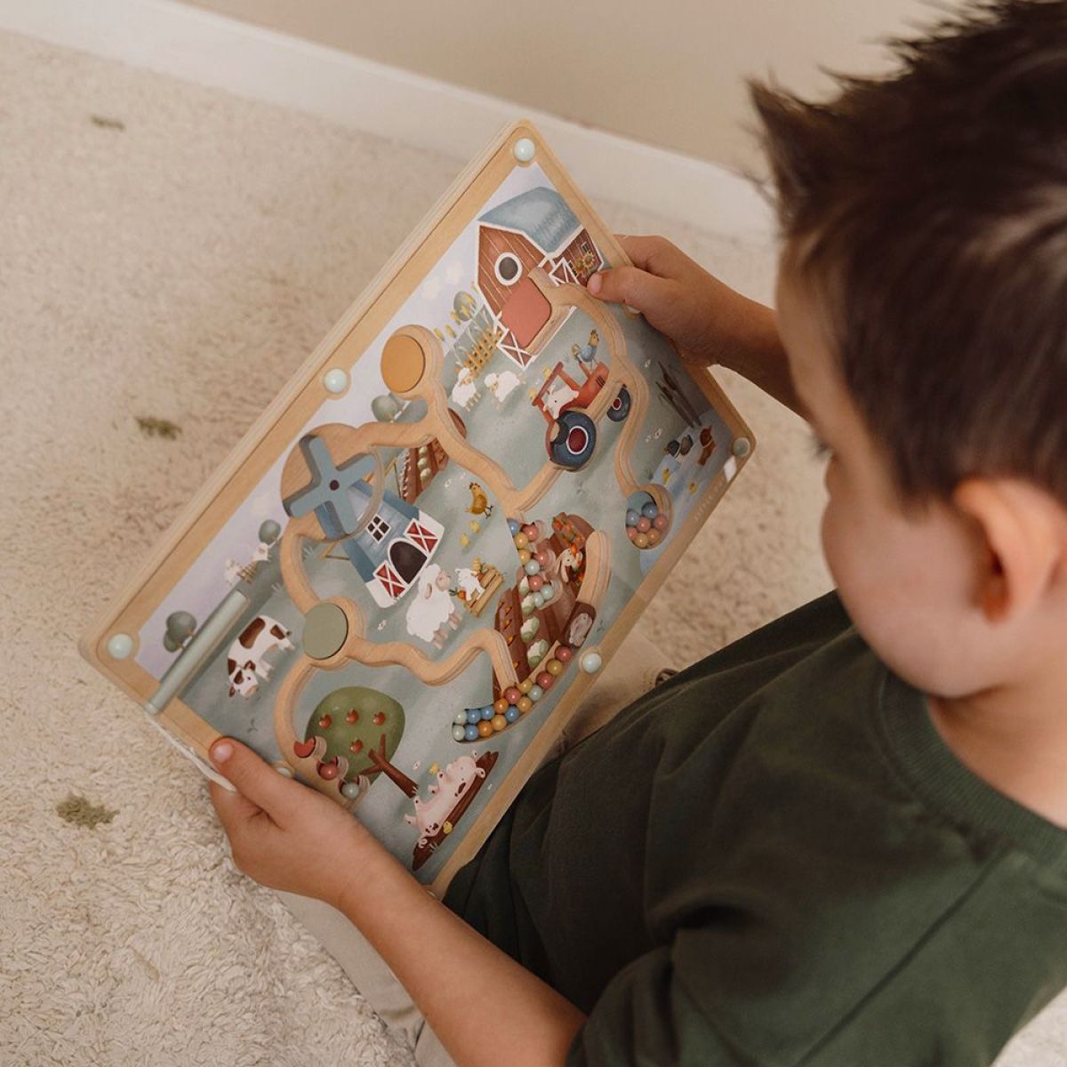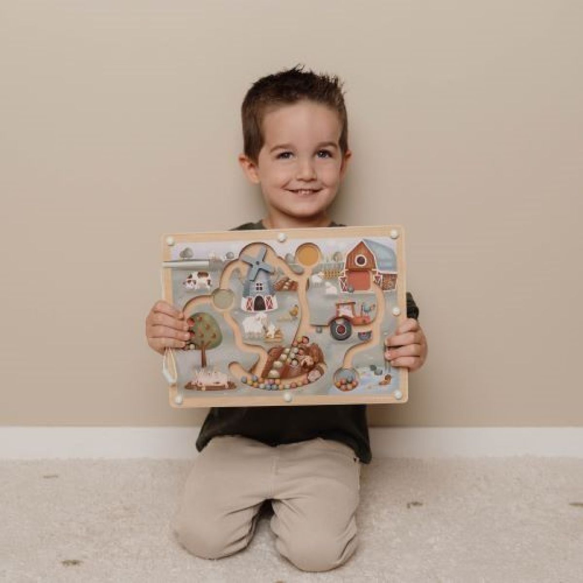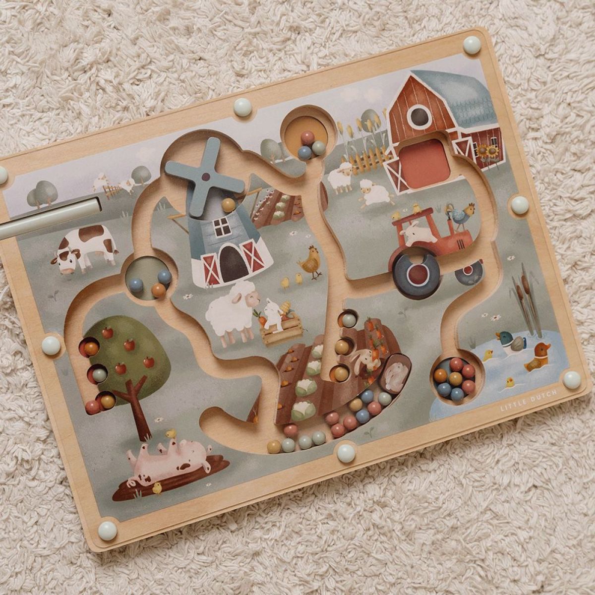 Objevte svět zábavy s magnetickým bludištěm Farma od Little Dutch. Tato originální dřevěná hračka s magnetickým perem umožňuje posouvat barevné kuličky po dráhách bludiště, které jsou zdobeny krásnými ilustracemi ze života na farmě. Děti si mohou hravě rozvíjet jemnou motoriku a smysly, zatímco překonávají překážky jako otočné kolo traktoru nebo lopatky větrného mlýna. Rozměry 30 x 22 x 1,3 cm zajišťují pohodlnou manipulaci. Věk: 18 měsíců a více. Hračka je součástí designové kolekce Little Dutch Farma.