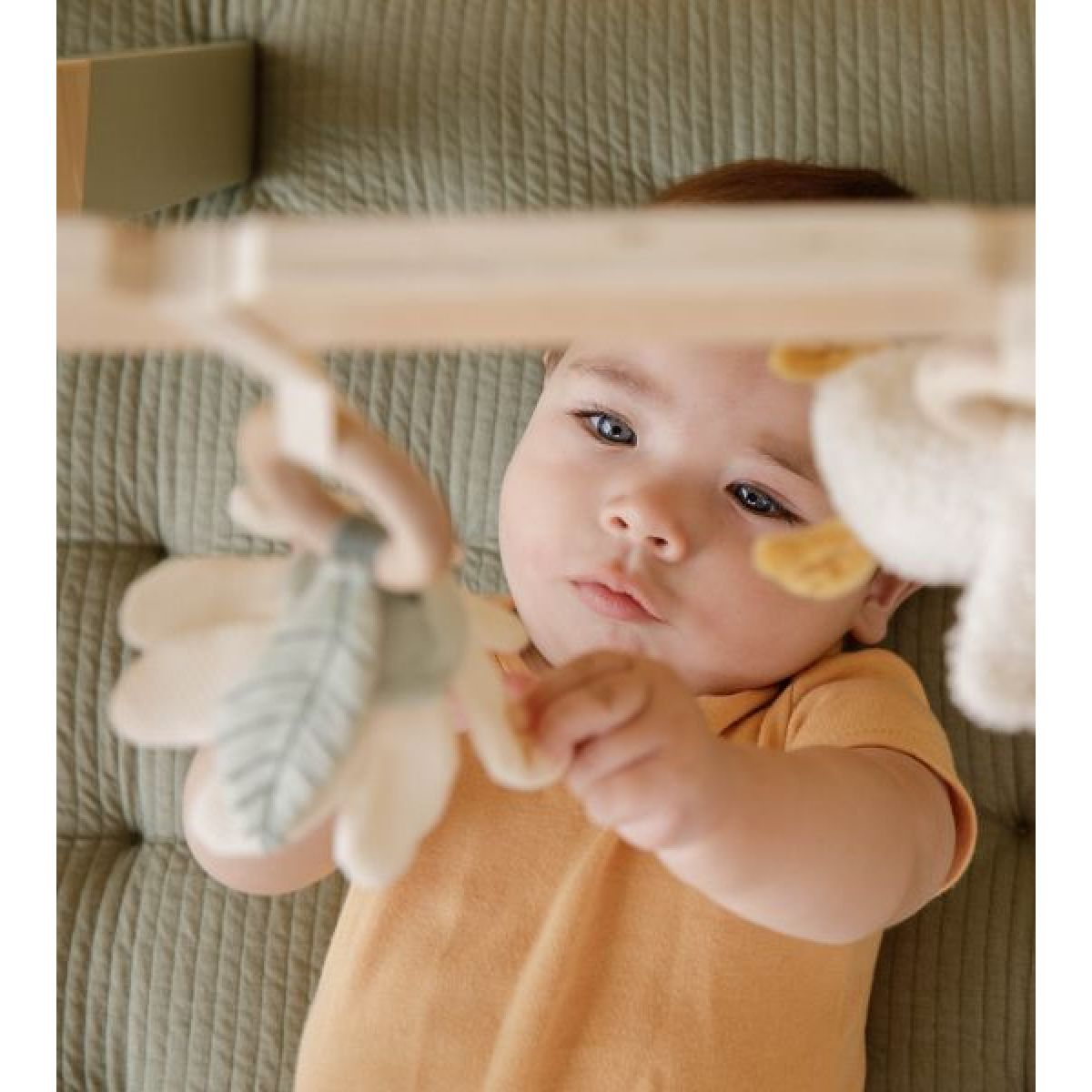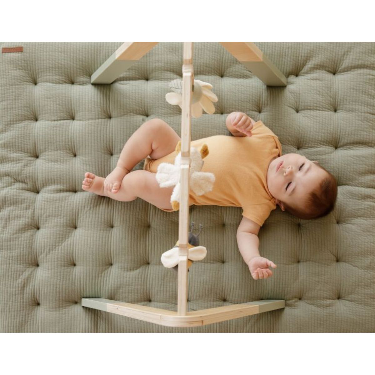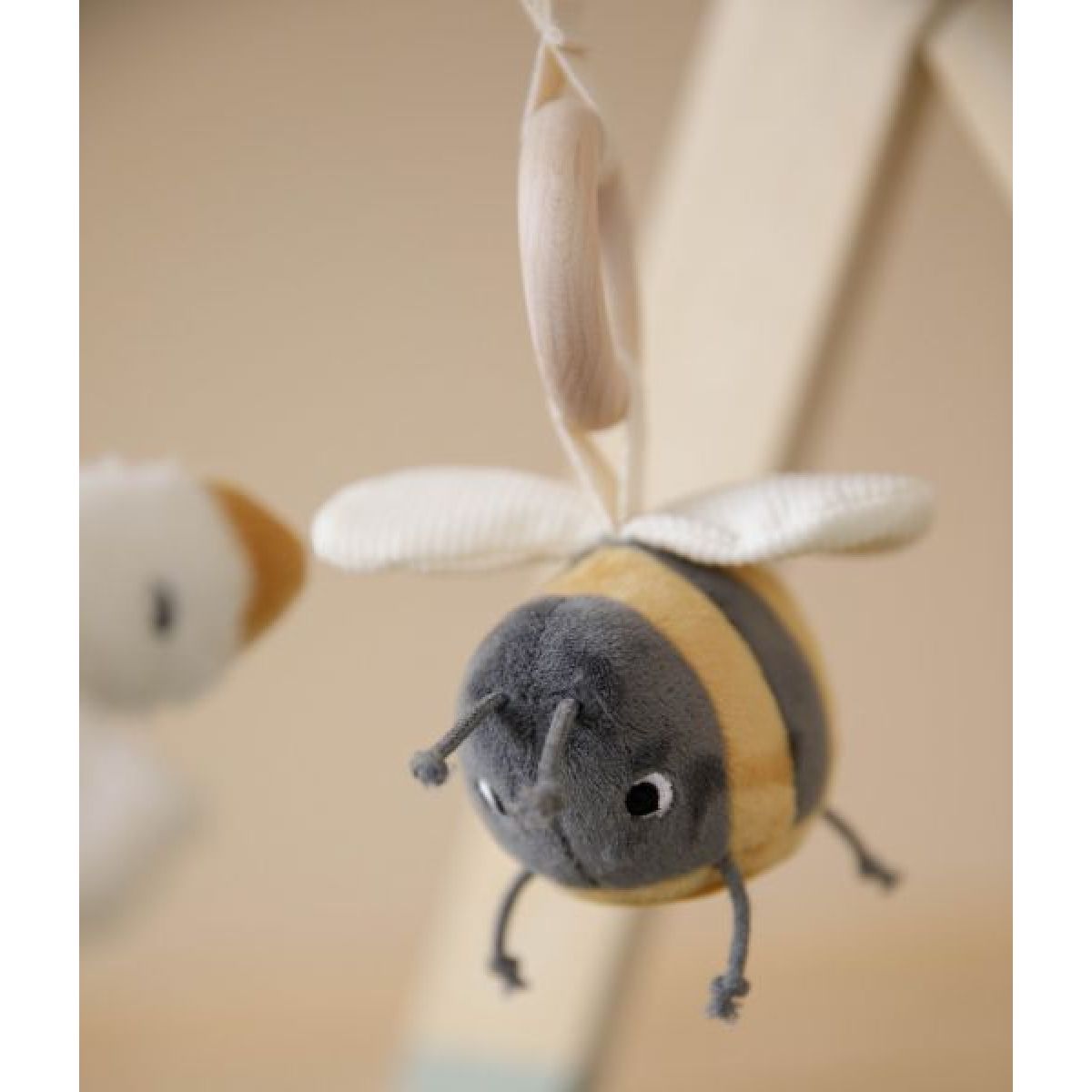 Stylová dřevěná hrazdička se třemi zavěšenými plyšovými hračkami v podobě husičky a jejích kamarádů poskytne vašemu miminku spoustu zábavy při hraní na dece.