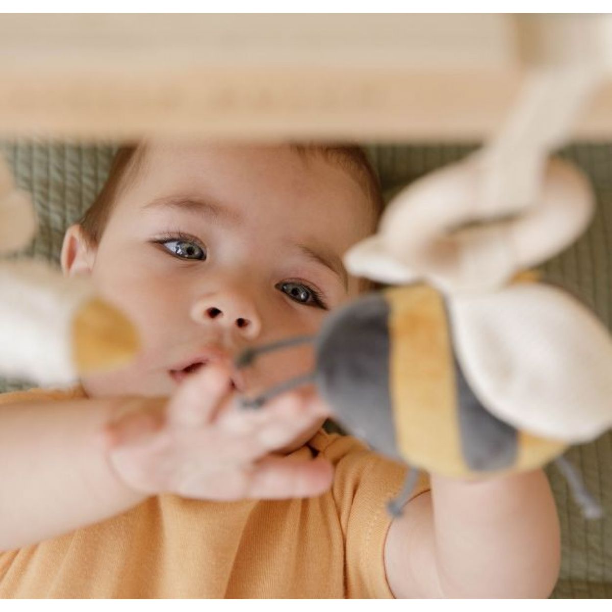 Jednotlivé hračky lákají dítě ke zkoumání a dotýkání, husička při pohybu chrastí, květina šustí a včelka má na bříšku bezpečné zrcátko.