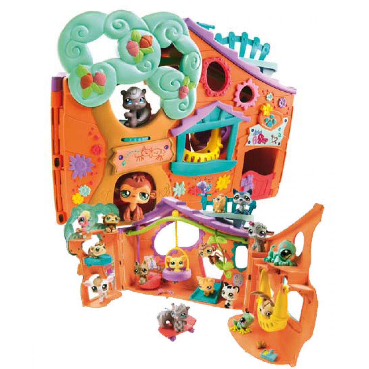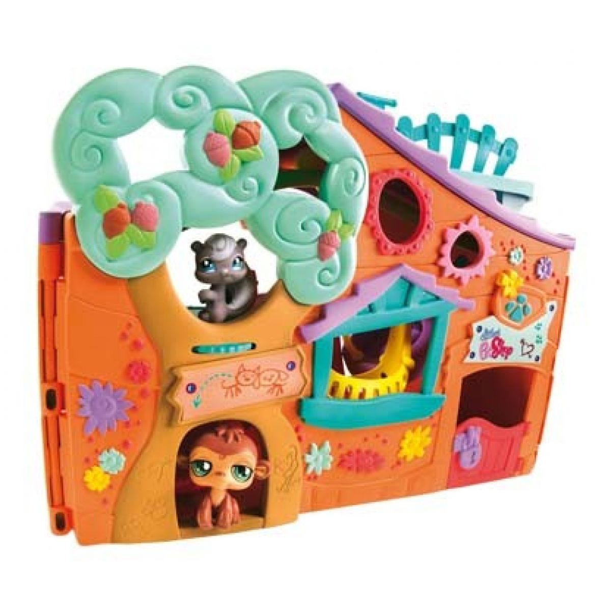 Barevný, rozevírací stromový domeček s mnoha patry pro hraní. Příslušenství a zařízení jako kolotoč pro zvířátka, liánová skluzavka a houpací síť dodávají hračce variabilitu. Se dvěma exkluzivními zvířátky: opicí a veverkou. Včetně funkce "vyzkoušej mě".