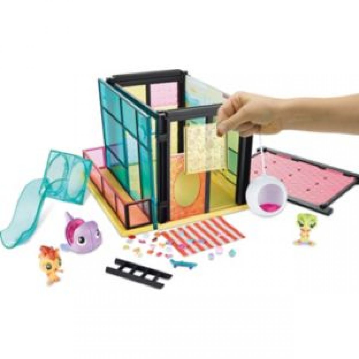 Vytvořte si svůj vlastní svět Littlest Pet Shop. Postavte pro svá zvířátka denní klub, kde si mohou hrát. Ozdobte ho pomocí samolepek a Deco bitů – jedinečného drobného příslušenství, které se dá připojit na zvířátka a hrací sety a tak jim přidají trochu kouzla a stylu. A teď ho zařiďte houpačkou, kolotočem a dalším zábavným příslušenstvím, které vaše petshopáky potěší. A nezapomeňte svůj nový denní klub pro petshopáky přiipojit do svého Littlest Pet Shop městečka. Hrací set obsahuje více než 100 dílků na sestavení a dekorování a dva petshopáky.