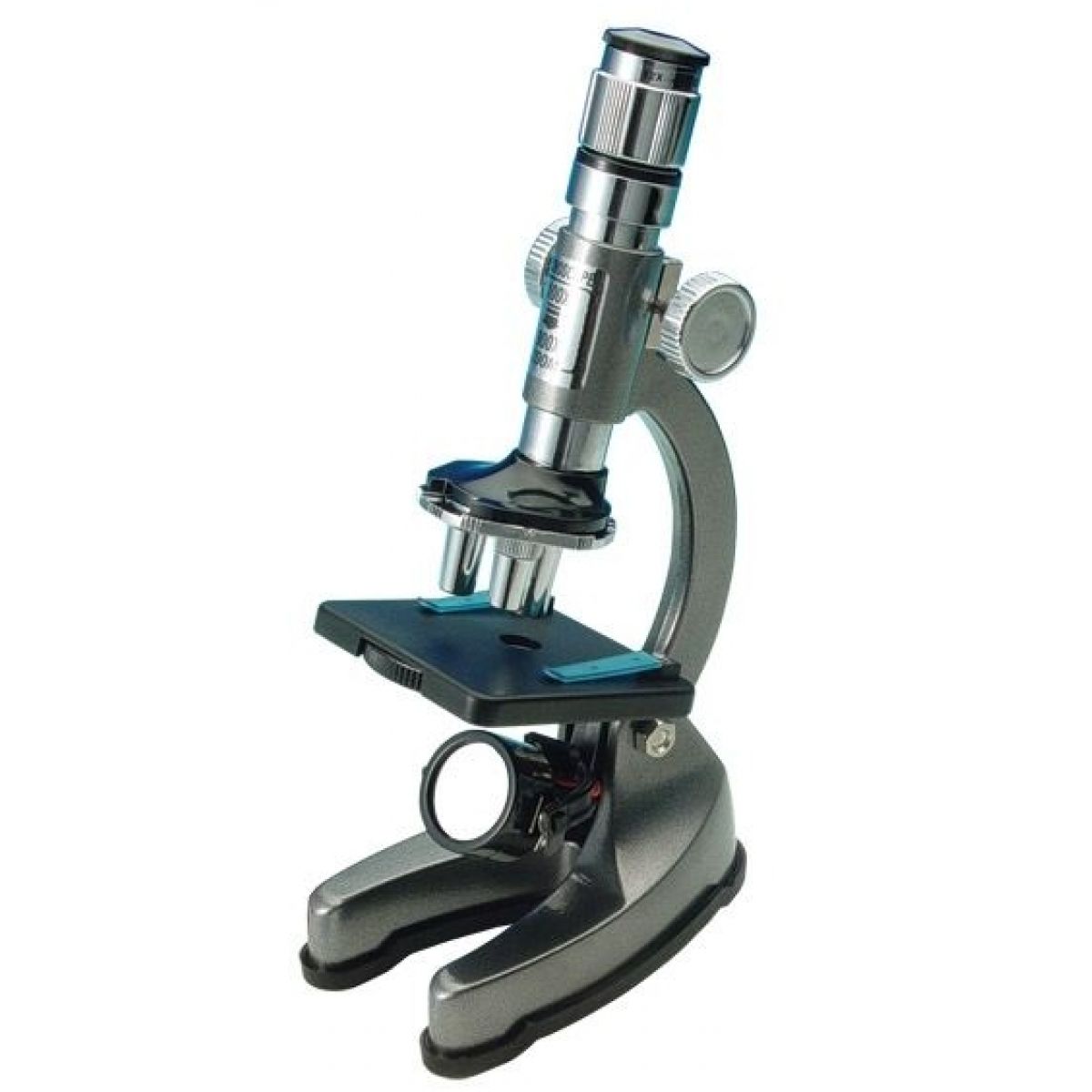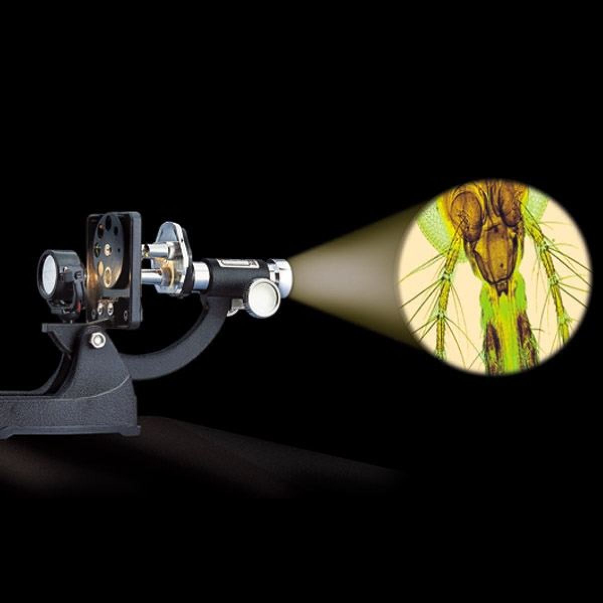 Mikroskop s kovovým tělem, lampičkou, projektorem a příslušenstvím. Mikroskop dosahuje zvětšení 100x-900x.