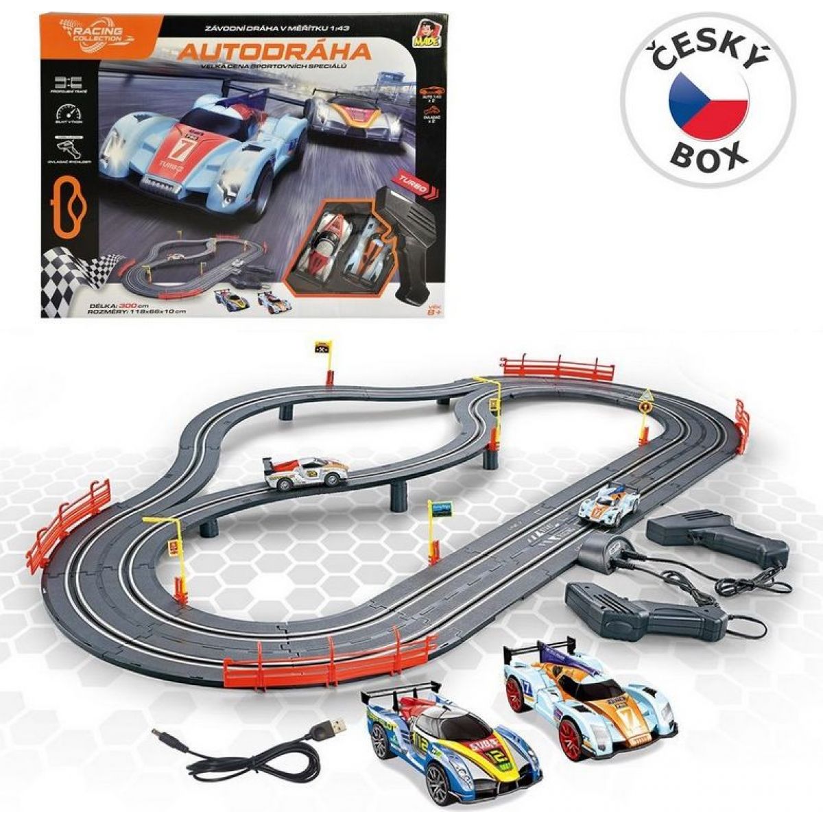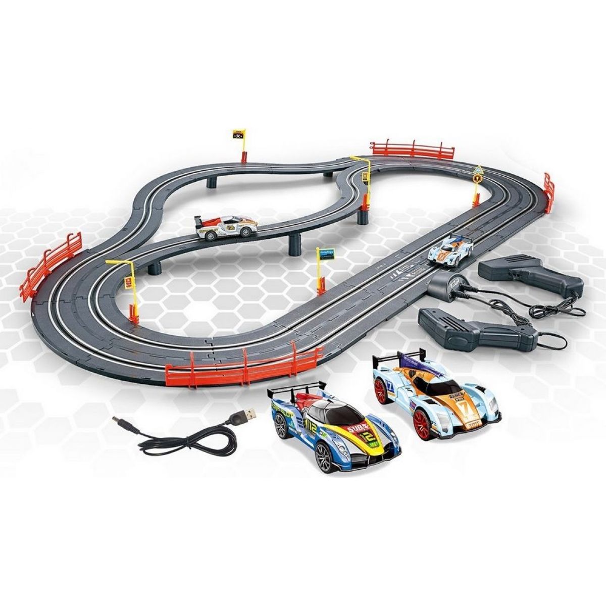 Sada obsahuje: 2 auta závodní speciály, 2 ovladače, s USB chargerem, s mostem a s příslušenstvím.
