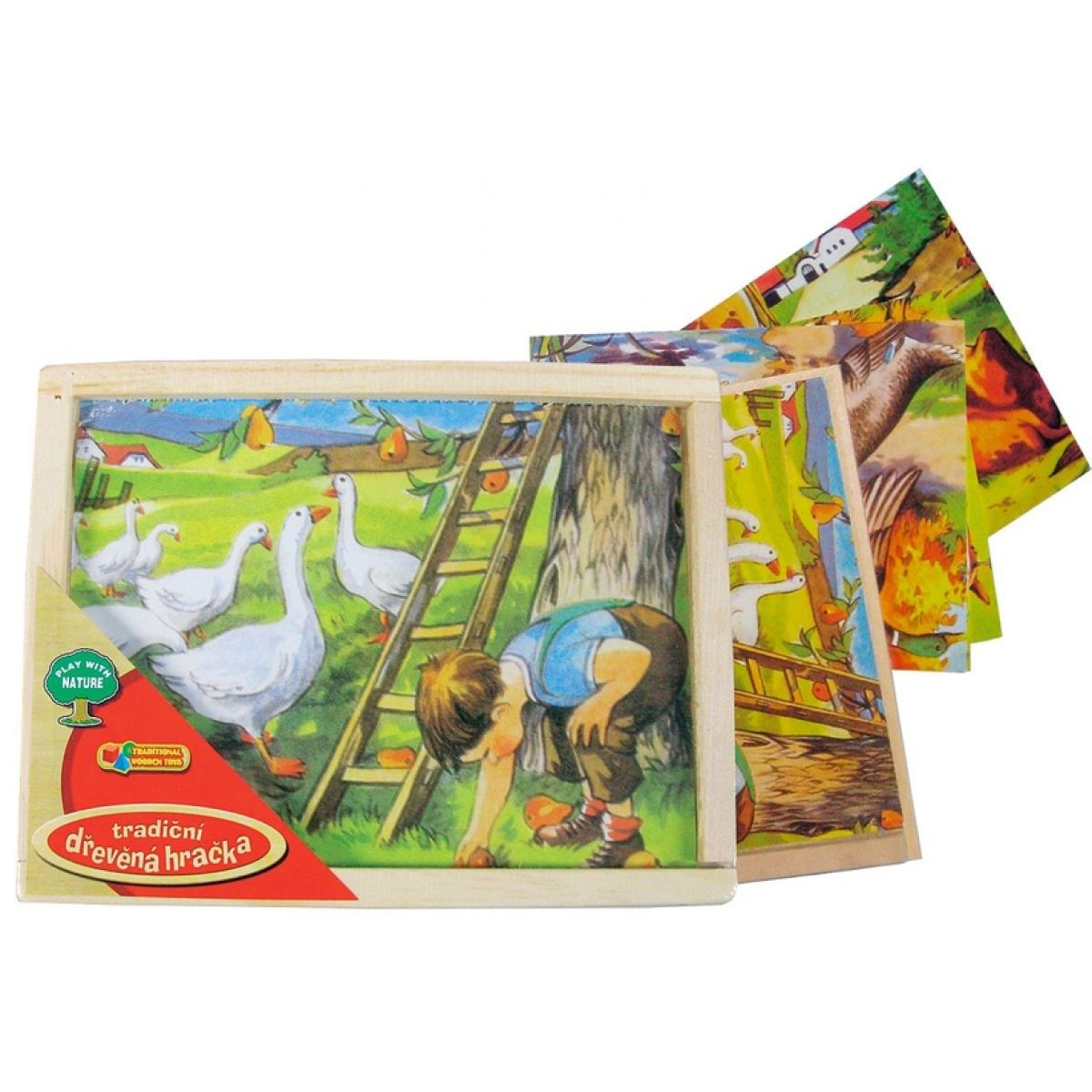 Dřevěné kostky s šesti obrázky zvířátek na venkově. Včetně šesti papírových předloh a dřevěné krabičky.