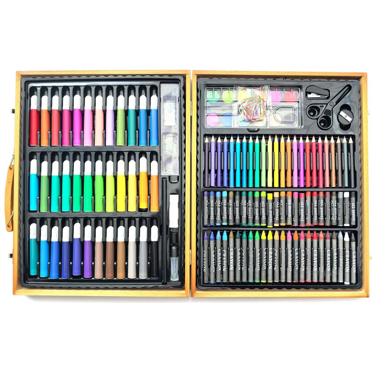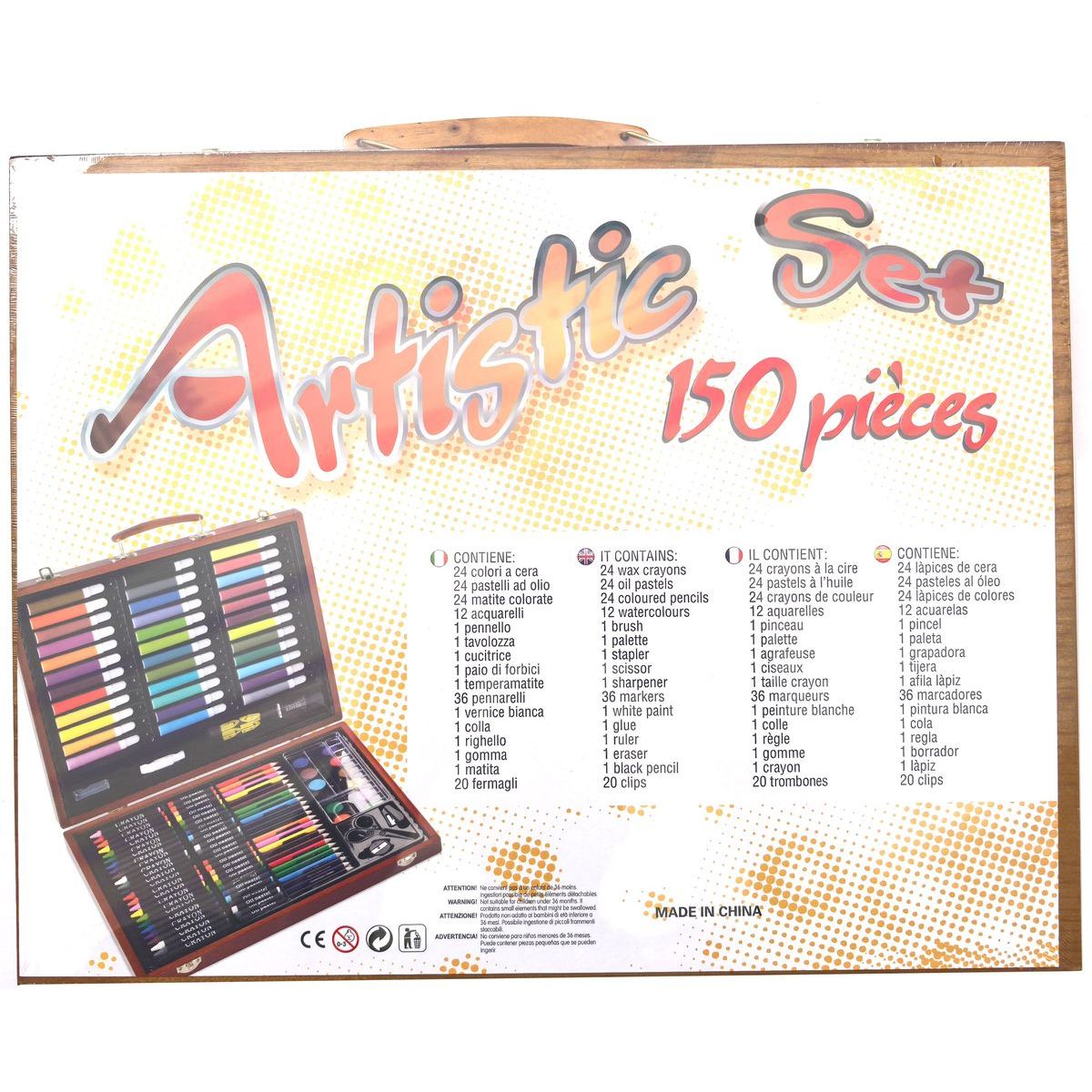 Vše, co malý i velký umělec potřebuje v jedné praktické sadě! Tento bohatě vybavený dřevěný kreativní kufřík obsahuje široký výběr výtvarných potřeb pro malování, kreslení, stříhání i lepení. Obsahuje: ✔️ 24 voskovek ✔️ 24 olejových pastelů ✔️ 24 barevných tužek ✔️ 12 akvarelových barev + paleta ✔️ 36 fixek ✔️ Ořezávátko, guma, černá tužka ✔️ Sešívačka, nůžky, lepidlo, pravítko ✔️ 20 spon na papír Celkem 150 kreativních pomůcek v jednom přenosném boxu – ideální na doma, do školy i na cesty!