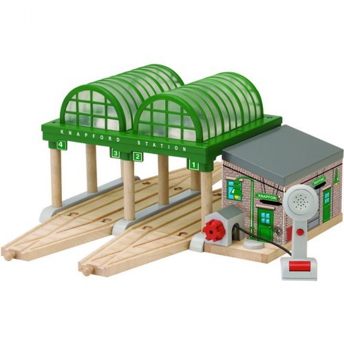 Knapfordské nádraží je dalším luxusním přírůstkem do vaší kolekce Tomášovy dřevěné vláčkodráhy. Knapfordské nádraží se skládá z odbavovací budovy, koncových zarážek a speciálních výhybek pro příjezd do nástupištní haly s průhlednou klenbou.