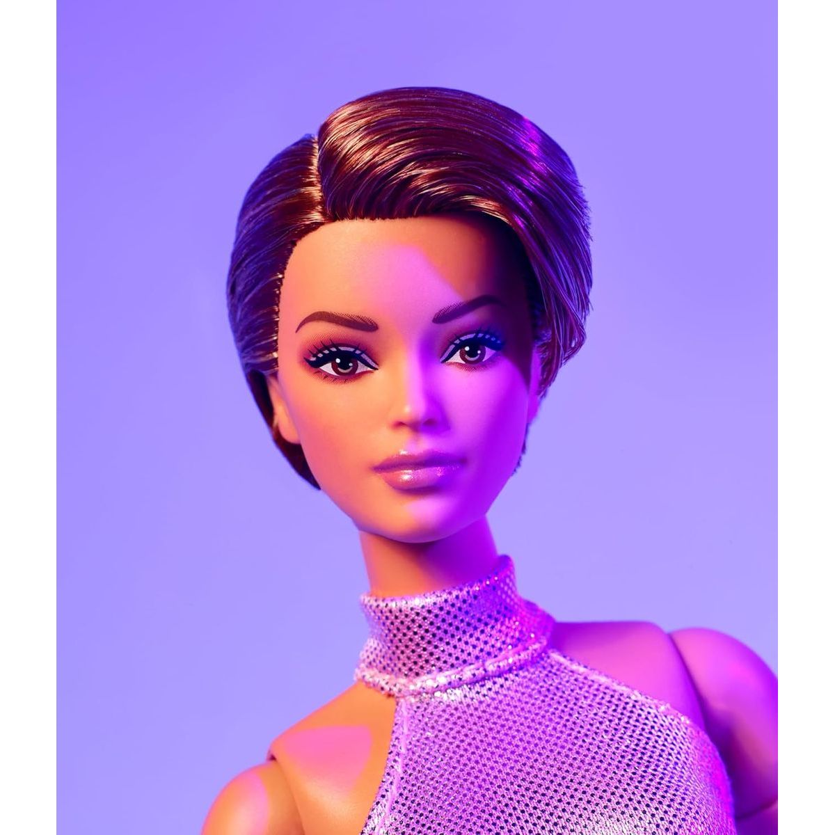 Tato polohovatelná panenka Barbie® Looks™ s pixie střihem má na sobě třpytivý overal.