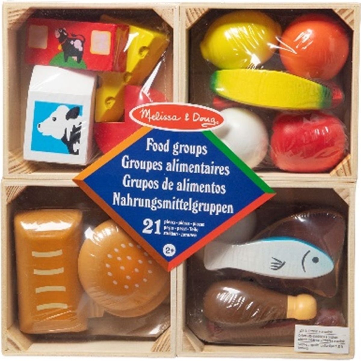 Melissa & Doug Jídelní set je dřevěná edukativní sada určená pro děti od 2 let, která kombinuje hru a učení o zdravém jídelníčku. Sada obsahuje 21 dílů, včetně různých dřevěných potravin a čtyř krabiček, které slouží k třídění, ukládání i jako pultík pro hru na obchod. Potraviny jsou vhodné pro dětské ruce a podporují rozvoj jemné motoriky, tvořivosti a poznávání základů výživy.