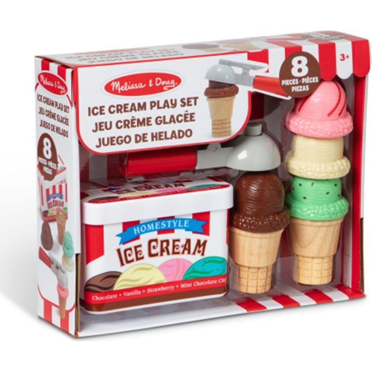 Melissa & Doug Kopečková zmrzlina – set je interaktivní rolová sada určená pro děti od 3 let, která kombinuje hru, učení a rozvoj motoriky. Sada obsahuje 8 dílů – čtyři magnetické kopečky v příchutích čokoláda, vanilka, jahoda a máta s čokoládovými kousky, dřevěné kornouty, naběračku a plastovou vaničku pro ukládání. Děti si mohou zkoušet vrstvení zmrzliny, což podporuje jemnou motoriku, koordinaci pohybů, základní počítání a rozpoznávání barev. Hra rozvíjí také jazykové dovednosti při simulaci prodeje a smysl pro pořádek při uklízení.