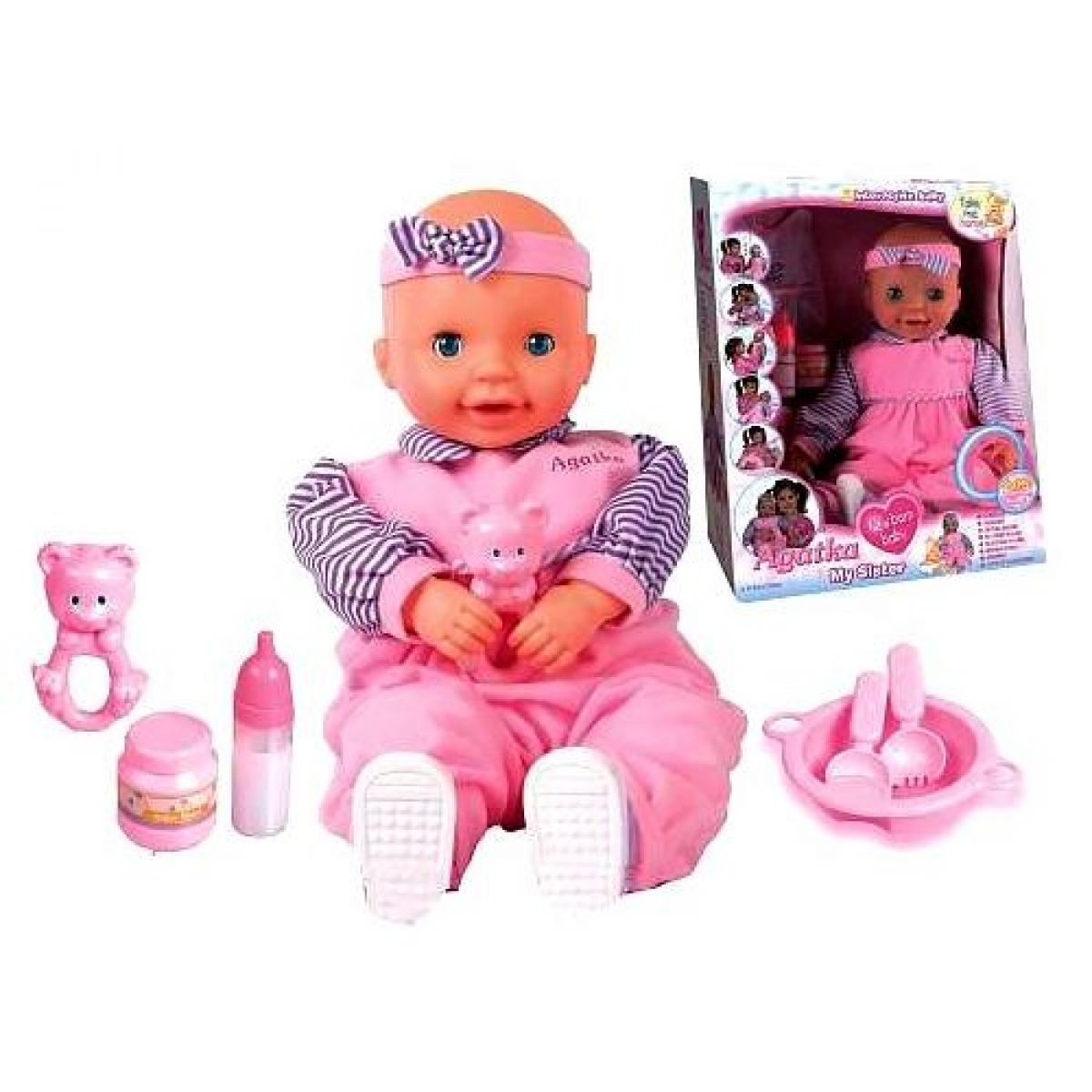 Miminko Agátka je největší miminko, které reaguje jako opravdové. Brouká a brumlá si jako miminko, mrká očičkama, pláče. Balení obsahuje lahvičku, hračku, jídlo pro miminko, talířek s příborem a bryndák.
