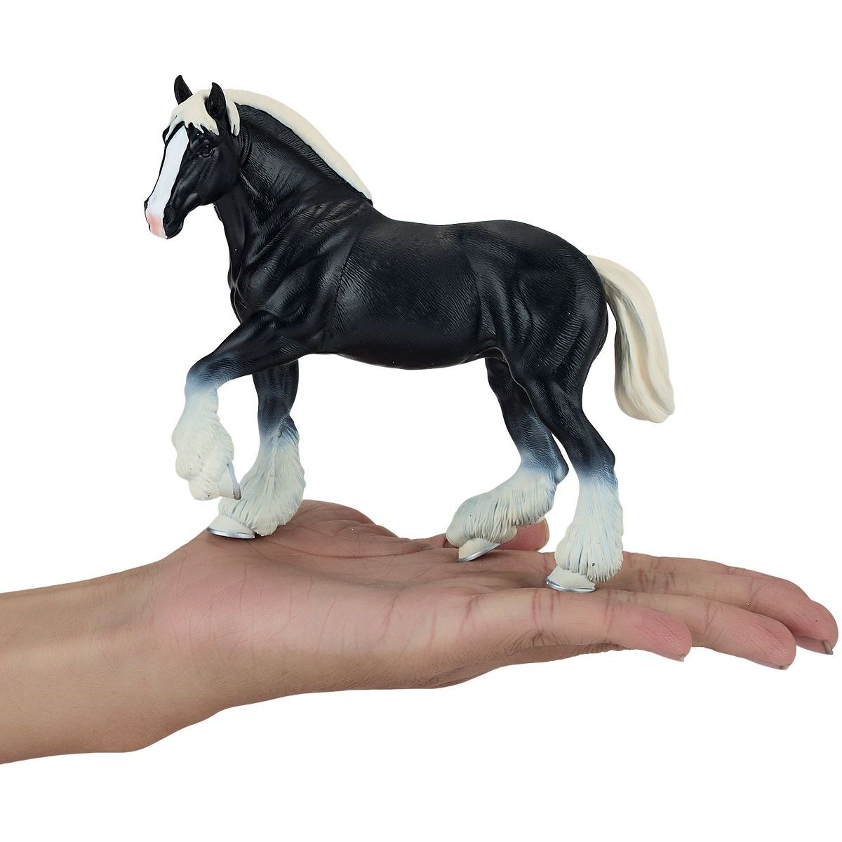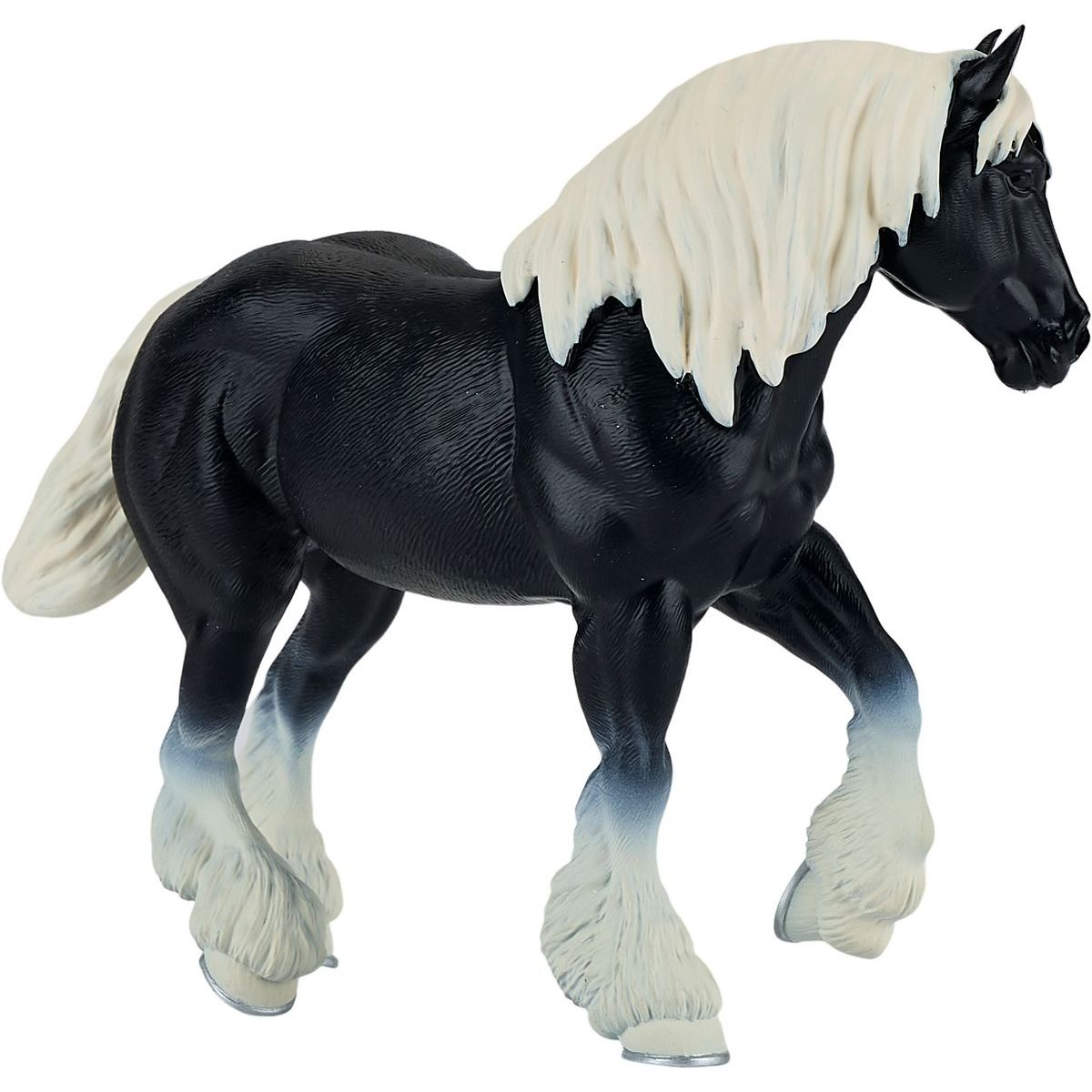 Impozantní figurka černého koně plemene Clydesdale, známého pro svou sílu, eleganci a vysokou stavbu těla. Tento krásně detailně zpracovaný kůň s tmavou srstí a silnými nohami zachycuje charakteristické rysy tohoto slavného pracovního plemene.