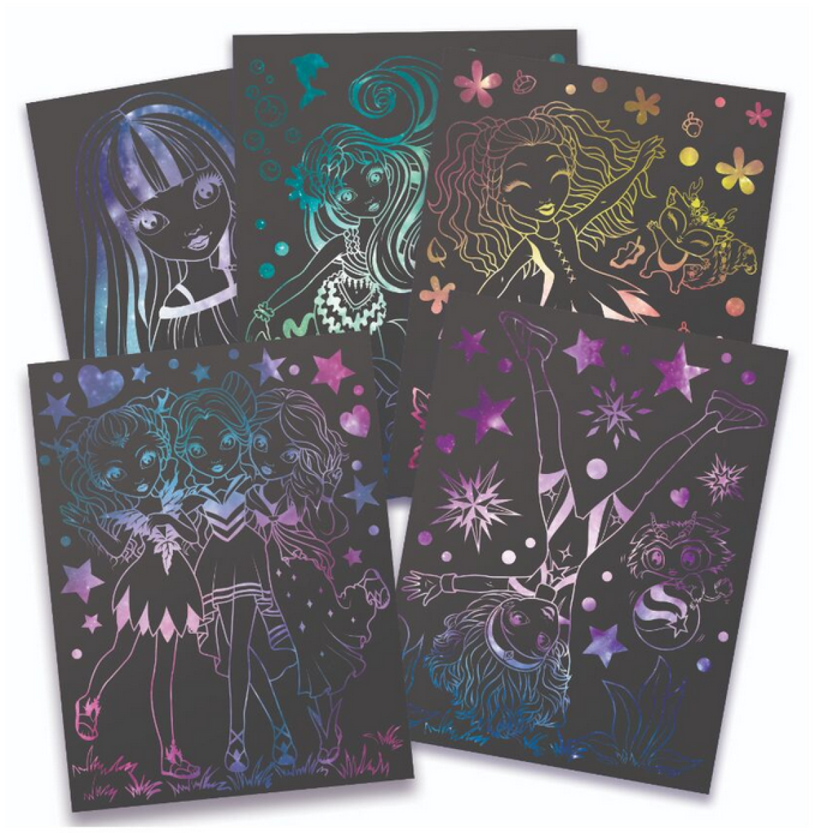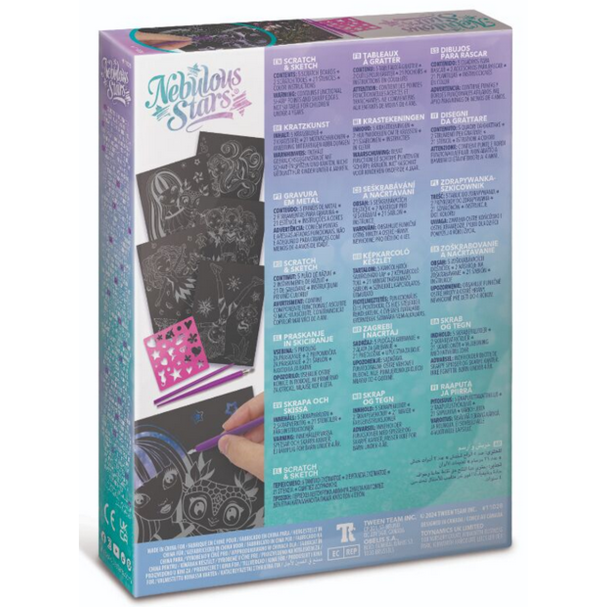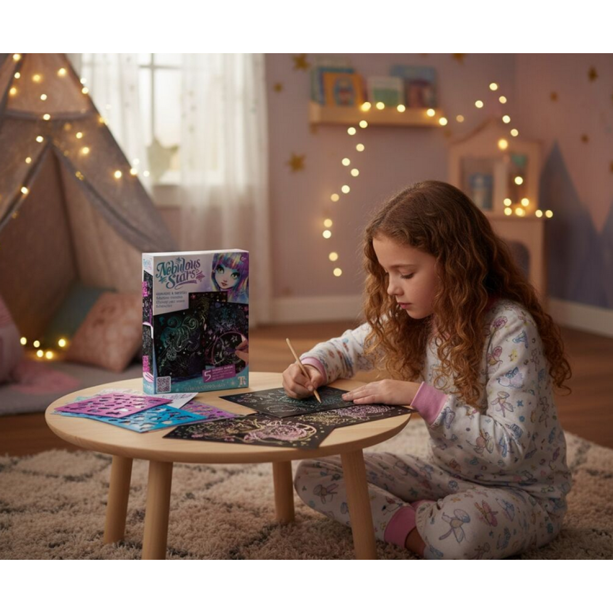 Kreativní sada Nebulous Stars Seškrabávací set nabízí zábavný a rozvíjející způsob tvoření pro děti i dospělé. Pomocí speciálních vyškrabávacích nástrojů lze na připravené kartičky odhalovat barevné motivy a vytvářet tak originální umělecká díla. Součástí balení je také šablonový arch s 21 tvary, návod a příběh postavy Isadory, který obohacuje zážitek z tvoření.