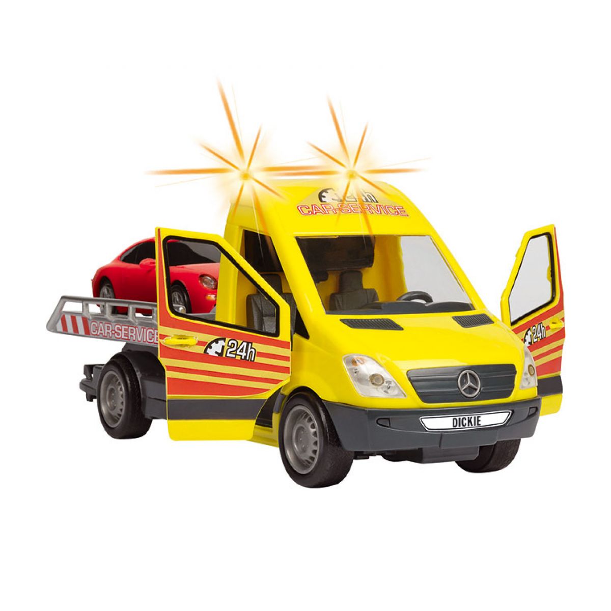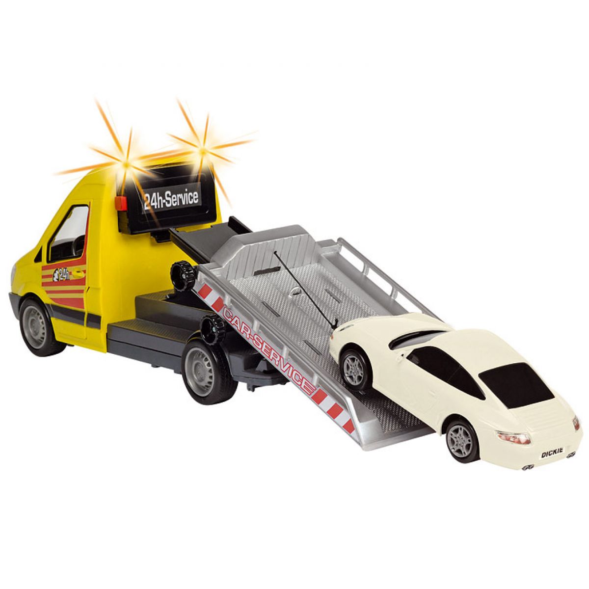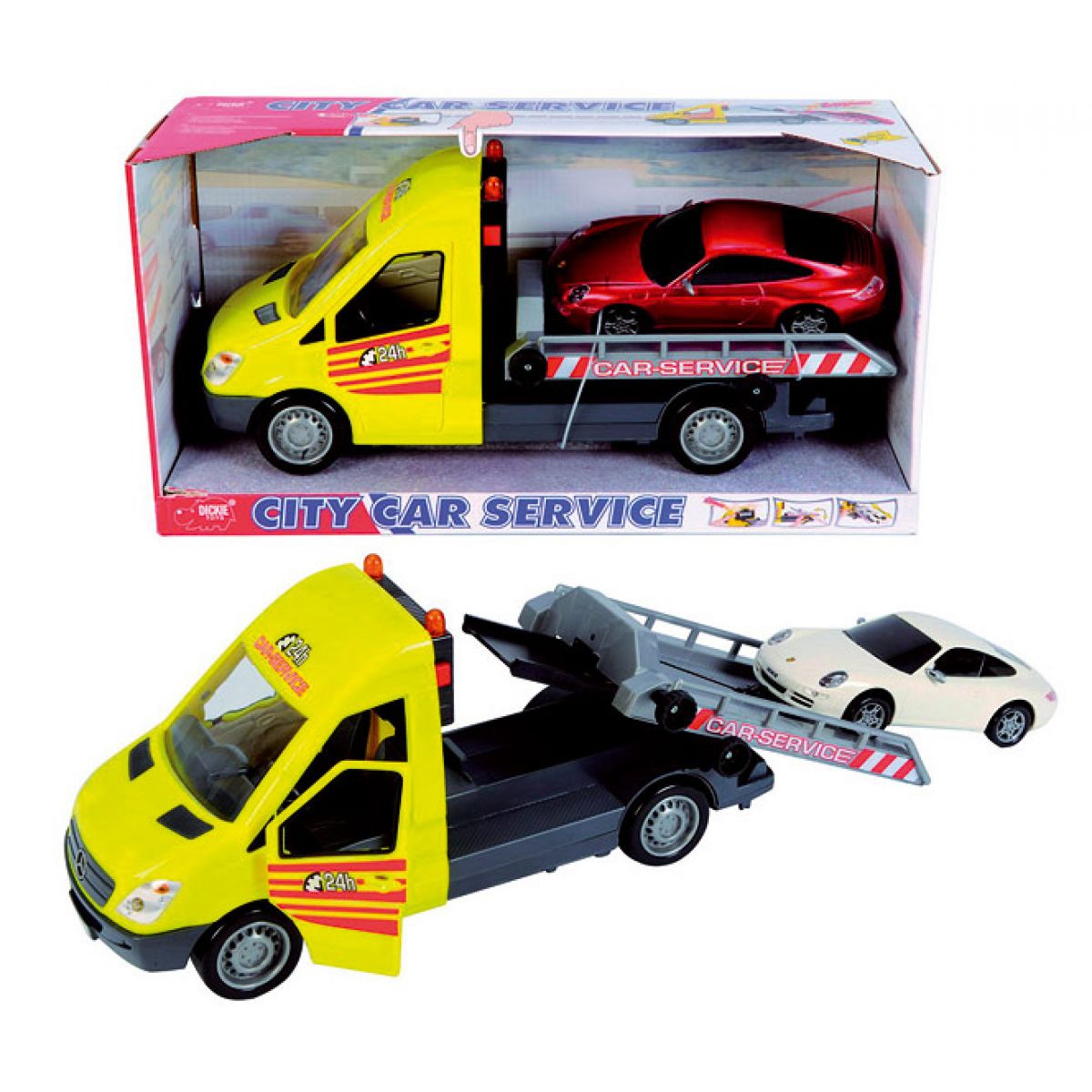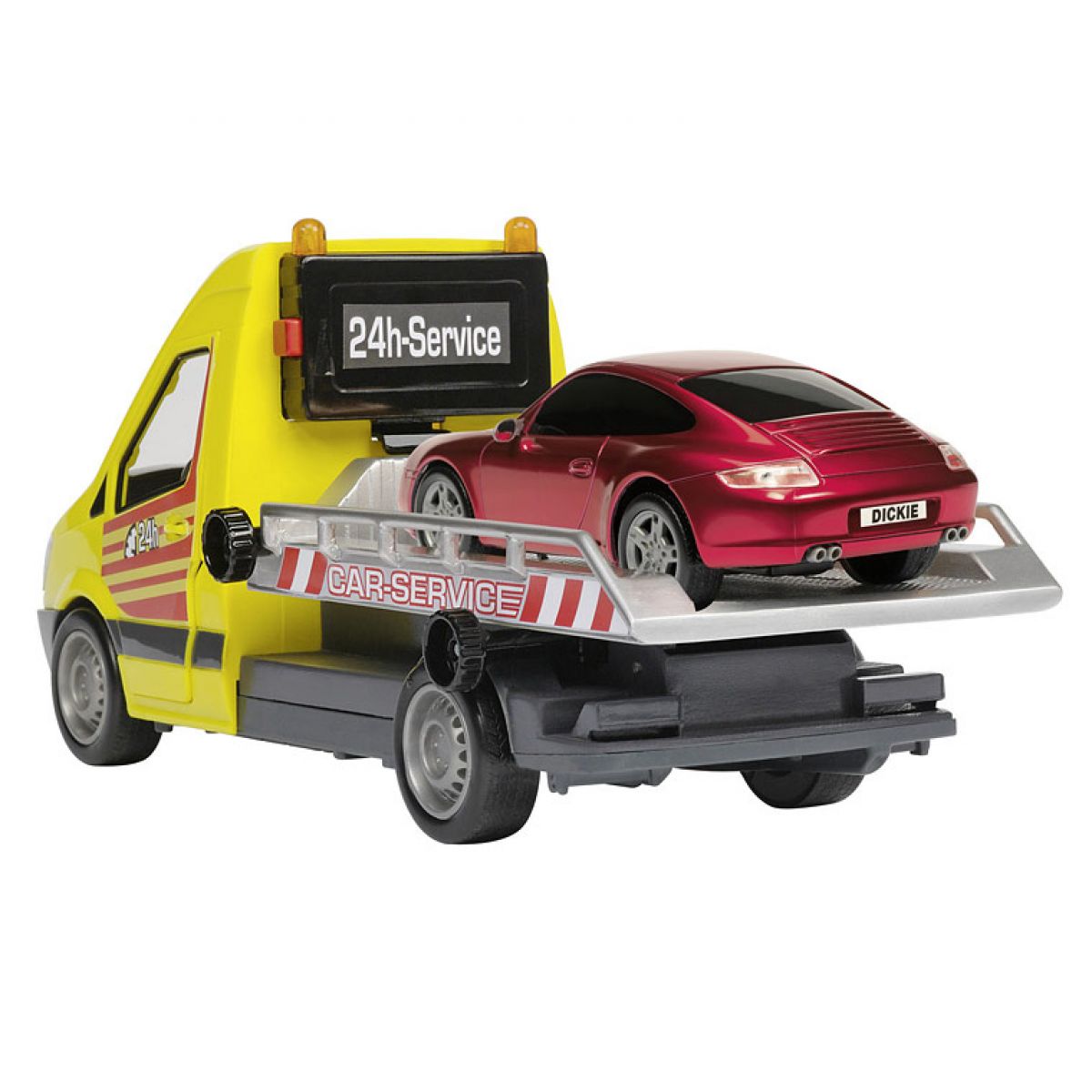 Odtahová služba (37cm) na setrvačník s osobním autem (18cm). S manuálním navijákem, sklápěcí plošinou a otevíracími dveřmi.
