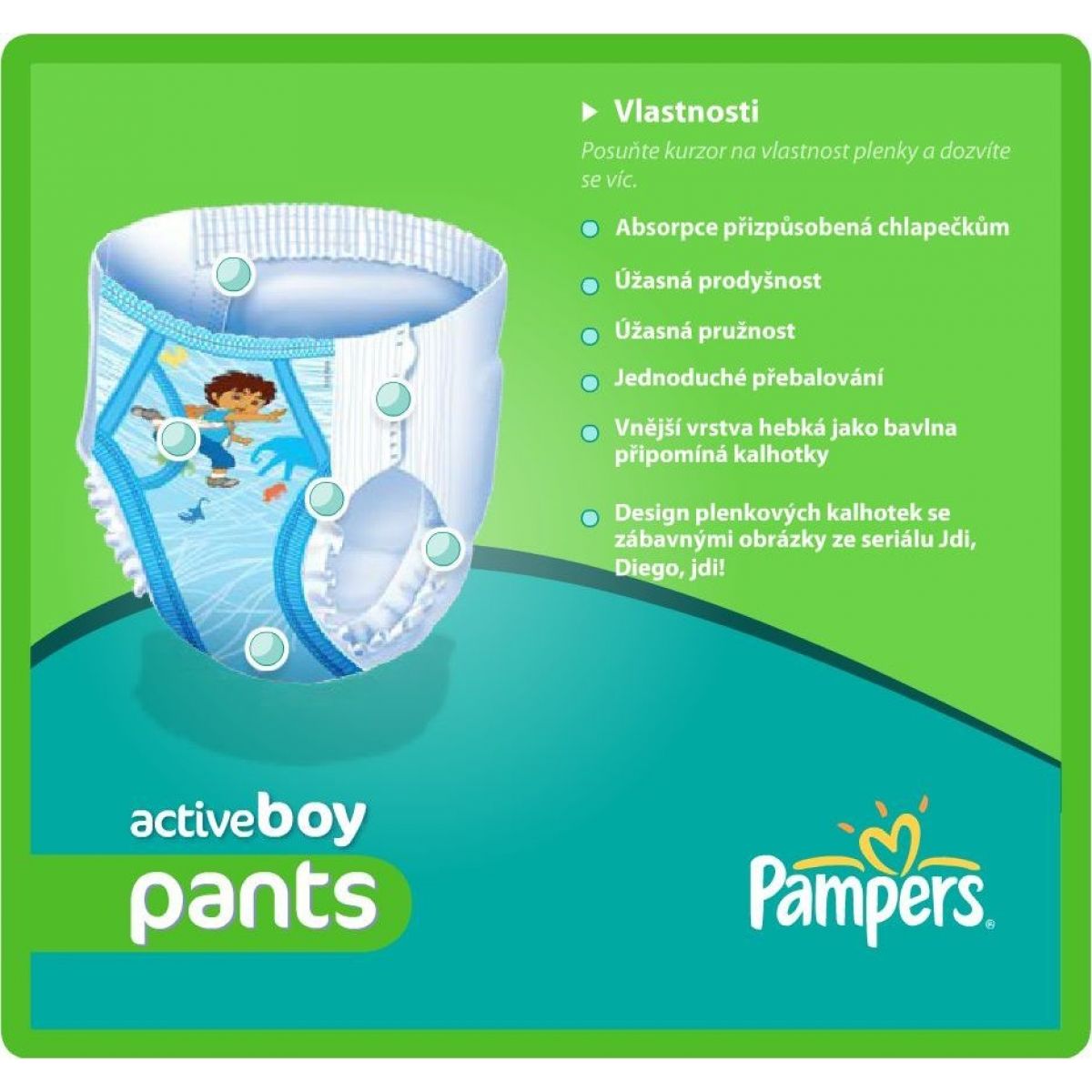 Plenkové kalhotky Pampers Active Boy, velikost 4 (9 - 14 kg), 52 kusů plenkových kalhotek v balení.