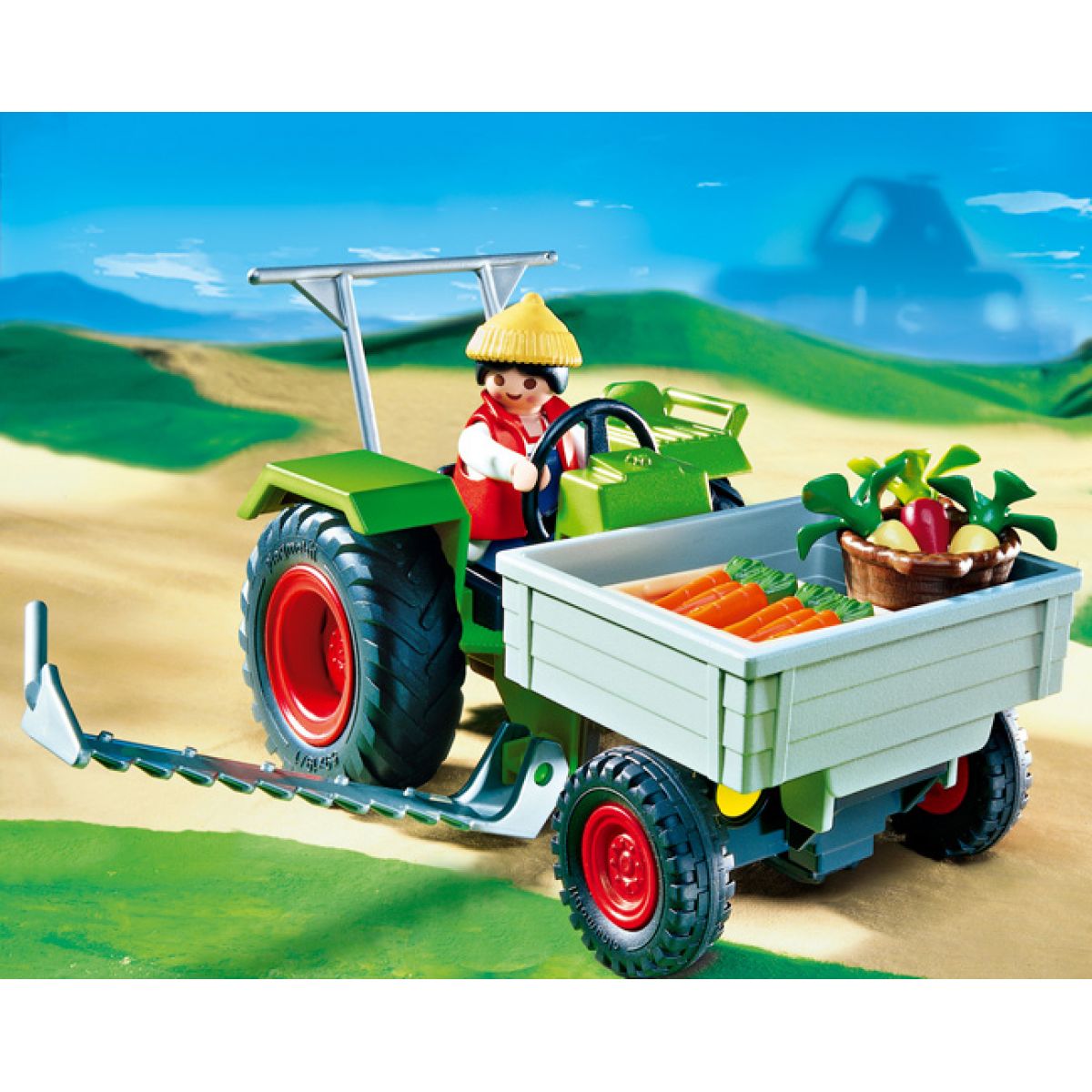 Balení obsahuje: traktor s žací lištou, postavičku traktoristky, košík, přepravku, 2 balíky mrkve, 4ks řepy.
