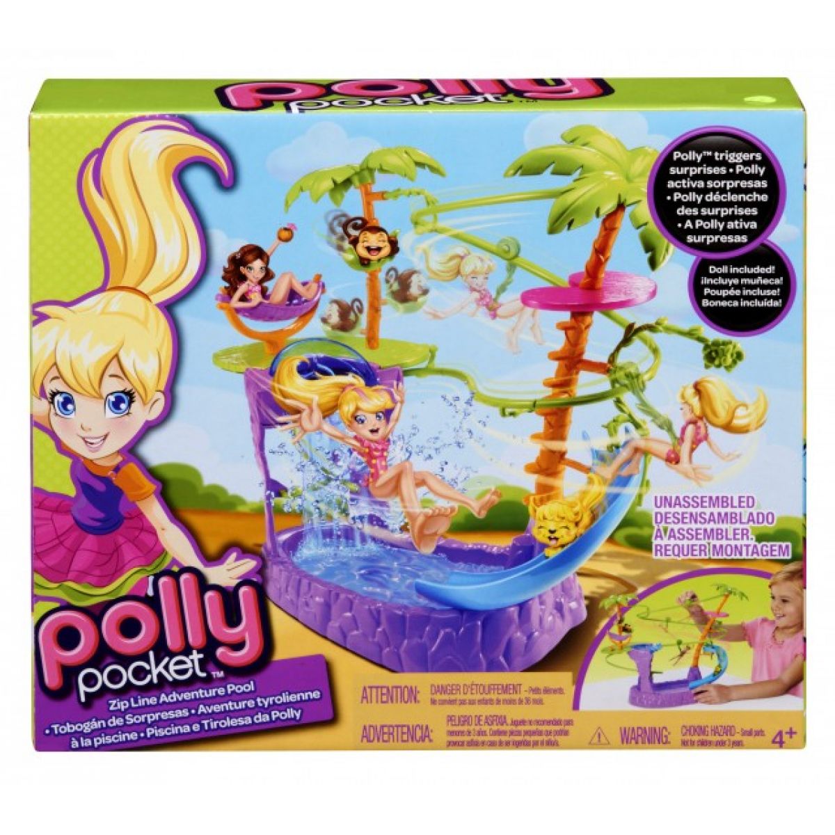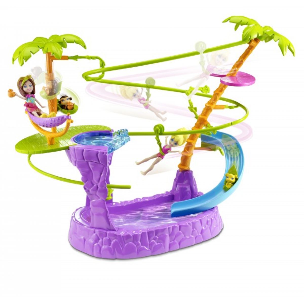 Sada obsahuje lanovou dráhu, panenku Polly, opičku, štěňátko (se skluzavkou z listu) a dva tropické nápoje.