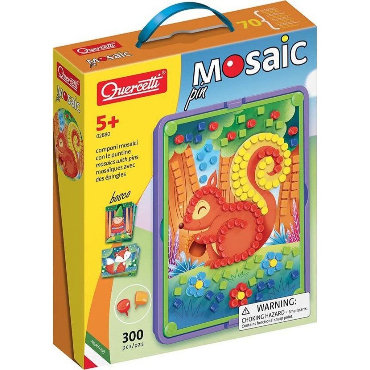 Quercetti Mosaic Pin Les kolíčková mozaika s úložným košem a 8 předtištěnými obrázkovými kartami pro zapichování kolíčků.
