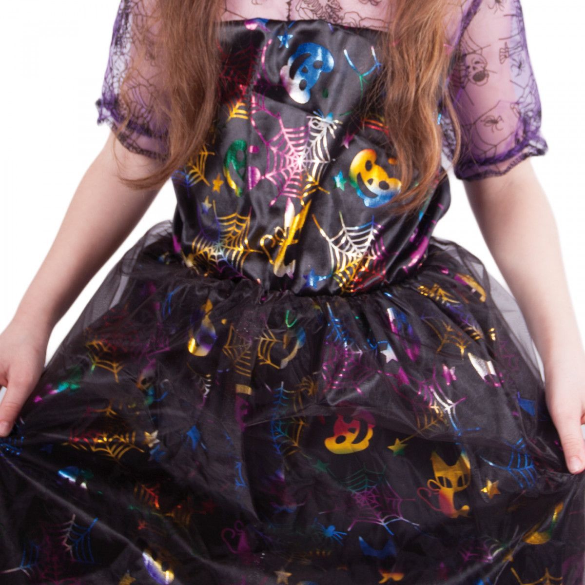 Roztomilý karnevalový kostým černo-fialové barvy udělá radost každé holčičce! Šaty jsou dekorovány barevnými halloweenskými motivy.