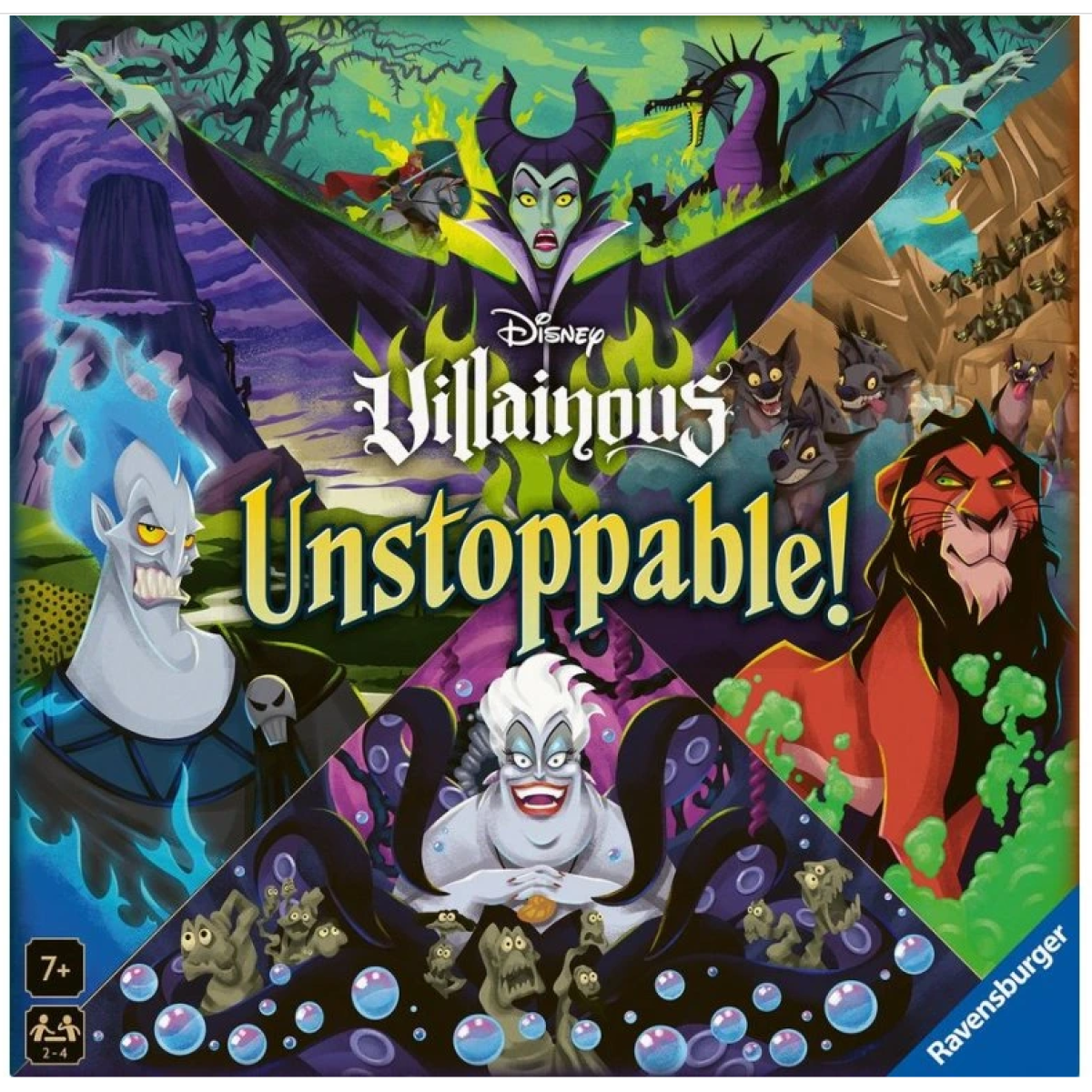 Ravensburger Disney Villainous: Unstoppable je strategická rodinná hra, ve které hráči přebírají role ikonických Disney záporáků – Zloby, Uršuly, Háda nebo Scara. Každá postava disponuje vlastním herním balíčkem, specifickými schopnostmi a jedinečným vítězným cílem, což poskytuje variabilní herní zážitek i při opakovaném hraní. Mechaniky jsou přístupné i začátečníkům, přesto však nabízí prostor pro plánování, taktiku a interakci mezi hráči. Tato edice je ideální vstupní branou do světa herní série Disney Villainous a skvěle funguje jak v rodinném kruhu, tak mezi fanoušky tematických strategických her.