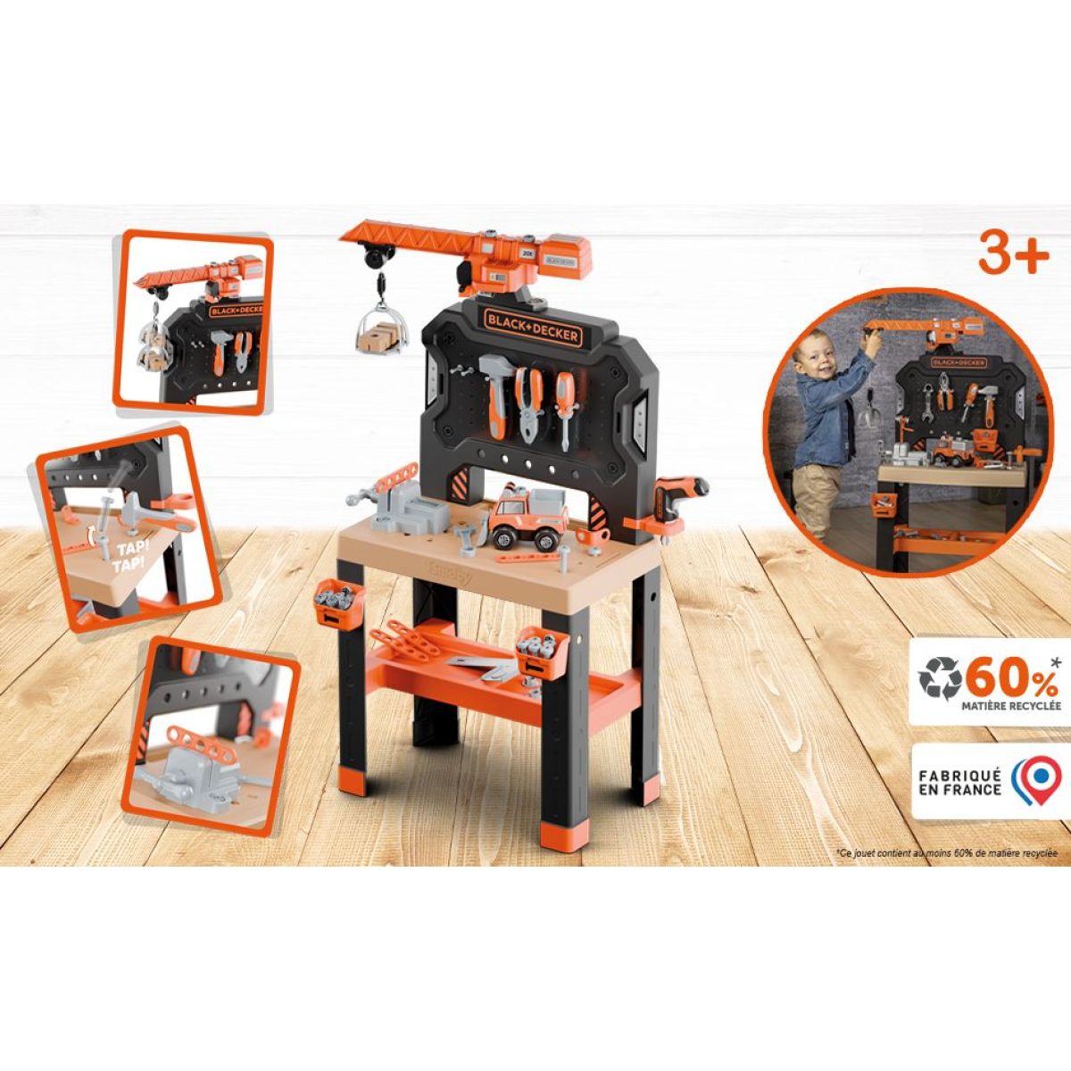 Objevte svět zábavy s velkou pracovní dílnou Smoby B&D, která nabízí stabilní a prostorný dětský pracovní stůl v designu dřeva. Tento originální produkt Black+Decker obsahuje 80 kusů příslušenství a 7 nástrojů, včetně mechanického aku šroubováku a velkého otočného jeřábu. Děti si užijí zábavnou funkci zatloukání hřebíků a možnost sestavit skutečné auto ve stavebnici. Dílnu lze rozšířit a je kompatibilní se všemi nástroji Black+Decker od Smoby. Rozměry produktu jsou 36 x 57,5 x 102 cm, což poskytuje dostatek prostoru pro kreativní hraní a rozvoj dovedností.