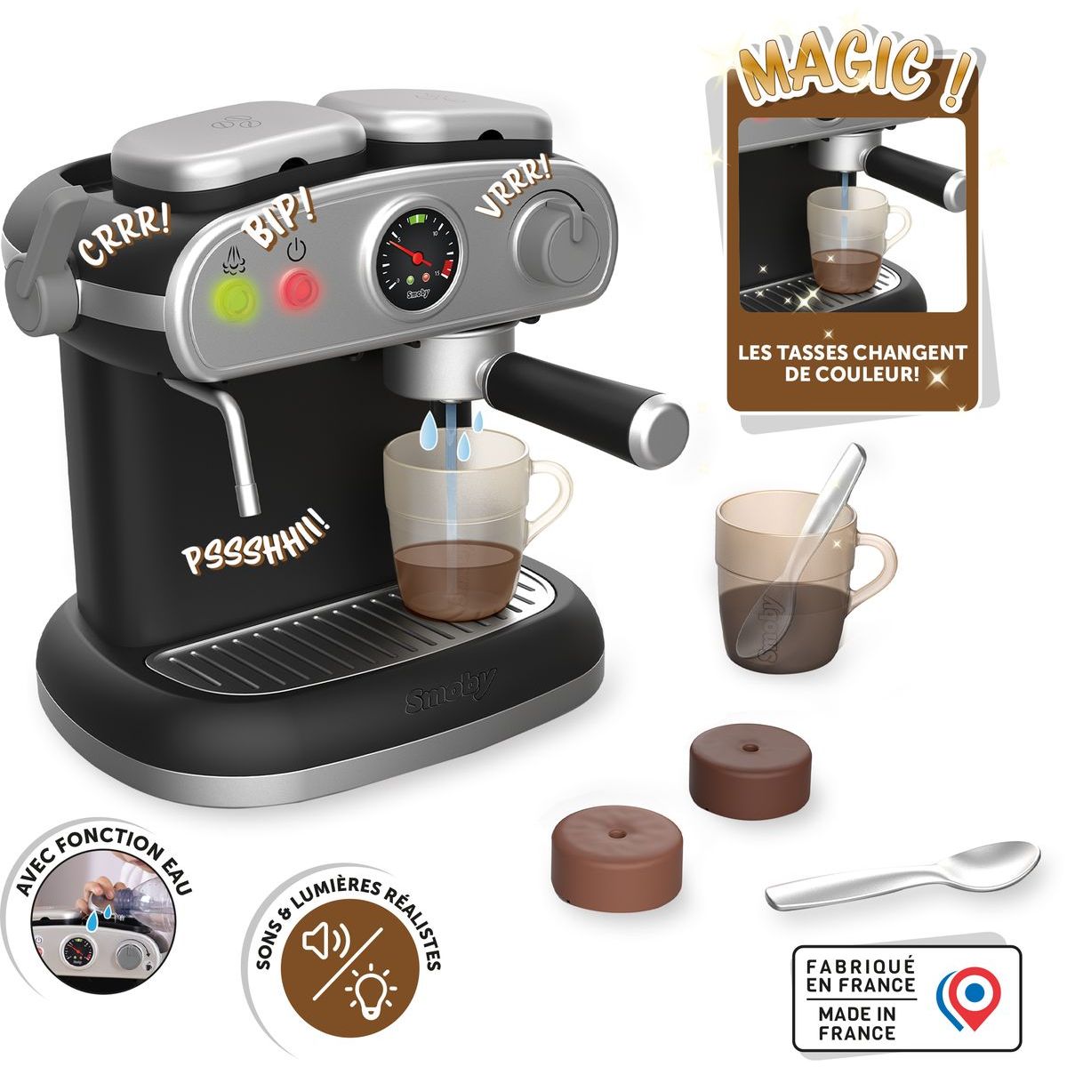 Objevte svět zábavy s kávovarem Smoby Espresso, který potěší malé i velké milovníky her. Tento moderní kávovar nabízí realistické zvukové a světelné efekty, které přinášejí opravdový zážitek z přípravy kávy. Součástí balení je šest doplňků, včetně kouzelných hrnků měnících barvu, lžiček a kapslí na kávu. S rozměry 16,5 x 21 x 21,5 cm je ideální pro dětské kuchyňky. Produkt vyžaduje baterie typu AA 1,5 V, které nejsou součástí balení. Věk: 3+ let. Klíčové parametry: - Věk: 3+ - Počet doplňků: 6 - Rozměry: 16,5 x 21 x 21,5 cm - Baterie: AA 1,5 V (není součástí)