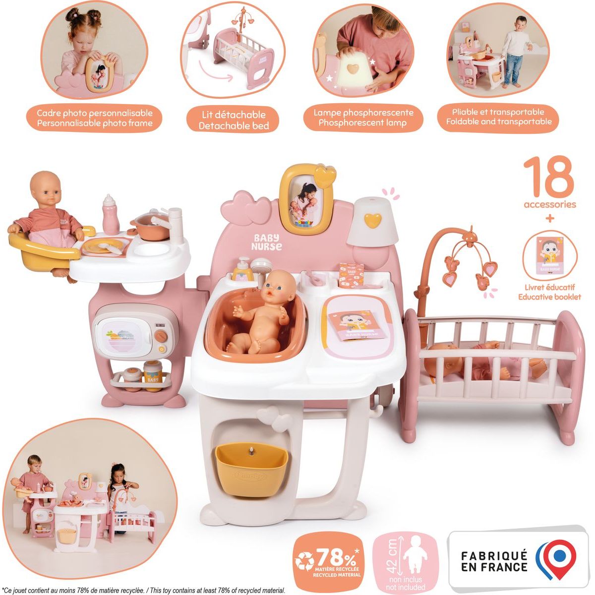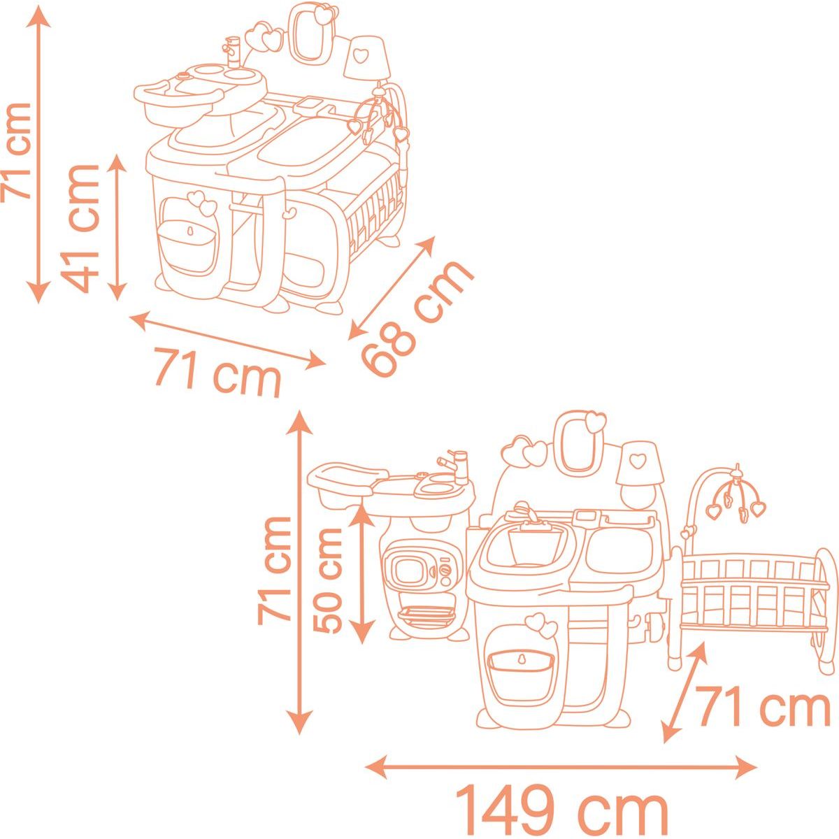 Objevte svět zábavy s hracím centrem pro panenky Smoby Baby Nurse, které nabízí tři prostorné hrací zóny – kuchyňku, koupelnu a ložnici. Tento skládací a snadno přenosný set je vybaven transportními kolečky a rukojetí pro pohodlnou manipulaci. Součástí jsou také odnímatelná vanička, přebalovací pult, věšák na ručníky a vyjímatelný odpadkový koš. Jídelní kout s nefunkční baterií, varnou deskou a mikrovlnnou troubou doplňuje spací část s postýlkou, otočným kolotočem a fosforeskující lampou. Příslušenství zahrnuje lahvičky, talíře, lžičky, hrnce a další doplňky pro kreativní hru. Vhodné pro panenky do 42 cm. Výrobek obsahuje minimálně 78 % recyklovaného materiálu. Rozměry složeného produktu jsou 68 x 71 x 71 cm, rozloženého 149 x 71 x 71 cm.