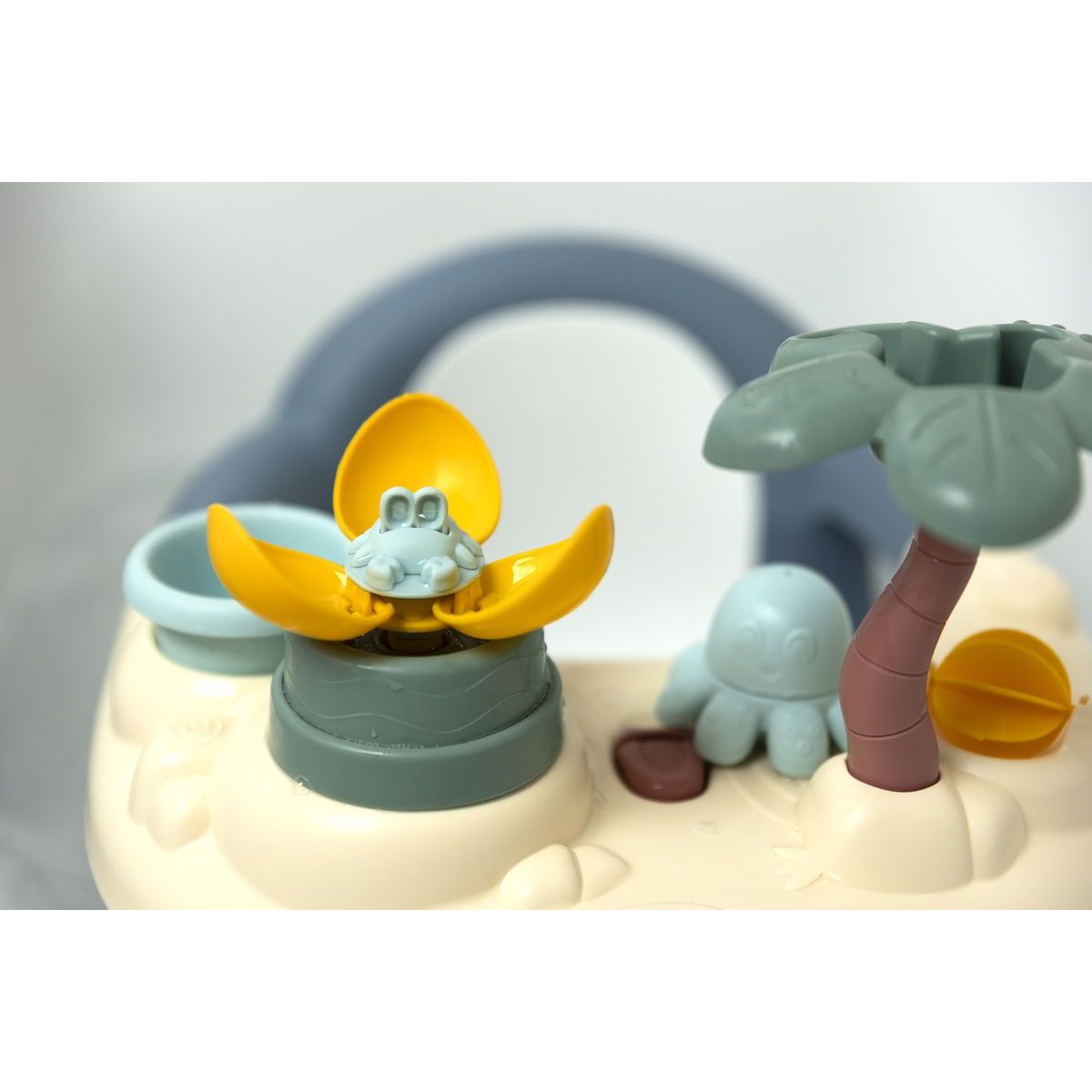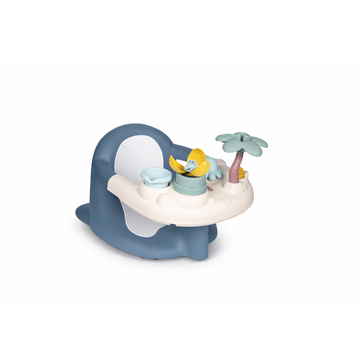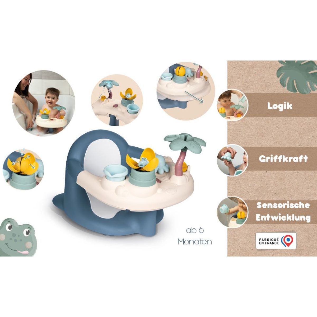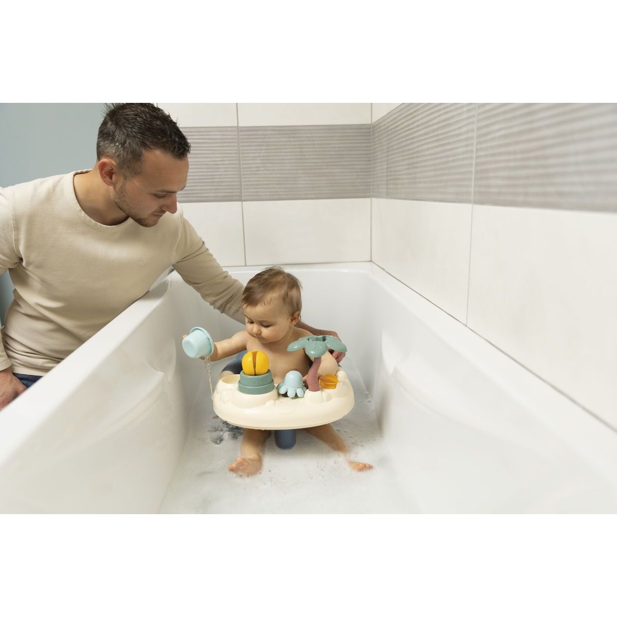 Ergonomický design s měkkým sedákem a zaoblenými hranami poskytuje maximální pohodlí a ochranu během koupání. Hrací pultík se snadno posune dopředu, což usnadní usazení dítěte díky chytrému bezpečnostnímu systému. Čtyři pevné přísavky zajišťují stabilní uchycení ve vaně, aby se předešlo nechtěnému pohybu. Děti si mohou hrát s pěti vodními aktivitami – vodním mlýnkem, kelímkem, palmovým rozprašovačem, kouzelnou květinou a chobotnicí stříkající vodu, které rozvíjejí jejich smysly i motoriku.