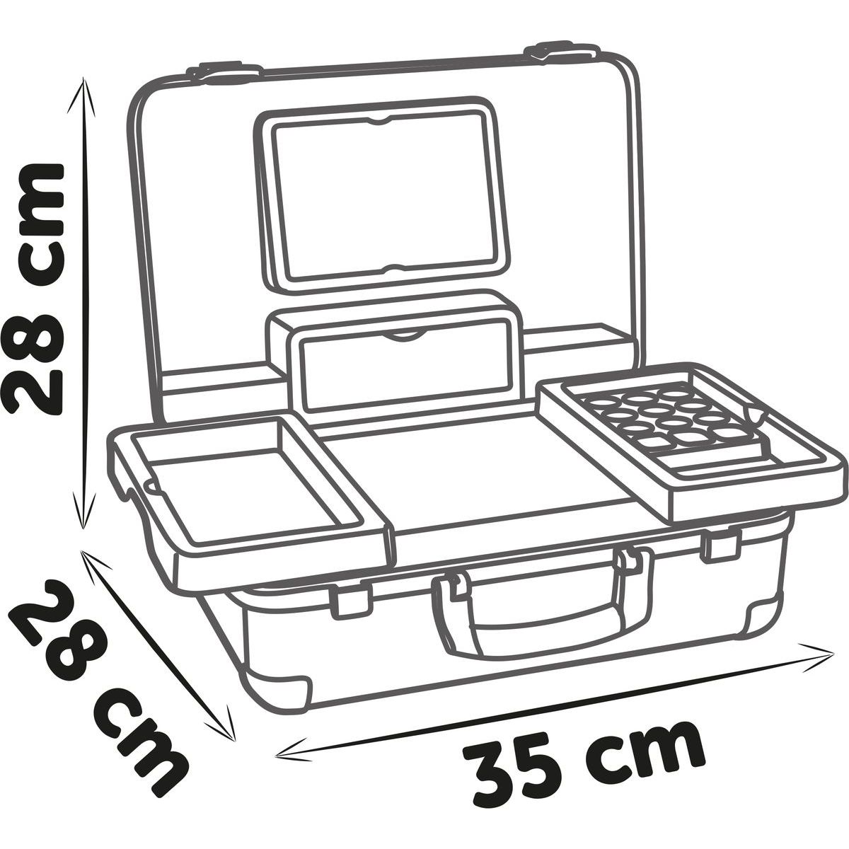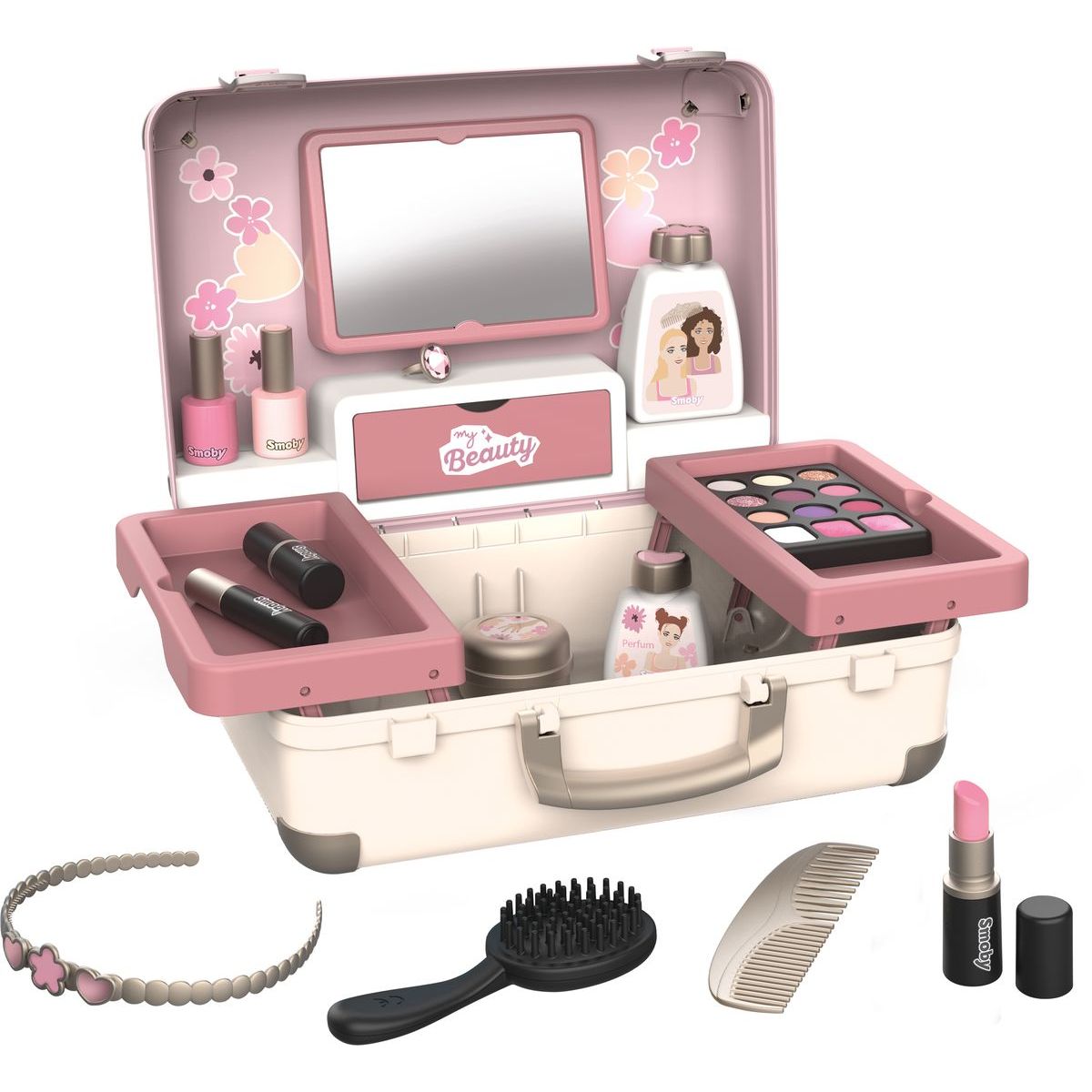 Kosmetický kufřík My Beauty je naplněn vším, co je potřeba pro skvělé mobilní wellness, ať už jde o účes, nehtový salon nebo make-up. Všech 13 doplňků (atrapy kosmetiky ke hraní) najdete uvnitř kufříku s rukojetí, který lze vzít kamkoli: 2 laky na nehty, 2 rtěnky, paleta očních stínů, řasenka, hřeben, čelenka, prsten a různé lahvičky. Díky možnosti zamčení se na cestě z kufříku nic neztratí. Navíc má zrcadlo a tajnou přihrádku. Police uvnitř lze sklopit, pro vytvoření prostoru pro další kosmetiku. Rozměry produktu (DxŠxV): 28 x 35 x 28 cm.