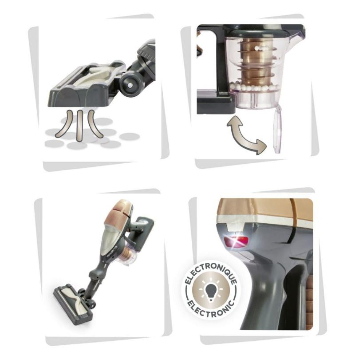 Po stisknutí tlačítka se rozsvítí LED kontrolka, vysavač vydává autentický zvuk sání a aktivuje se jemná funkce přisávání, která uvnitř nádoby roztočí drobné kuličky – stejně jako u skutečného přístroje.