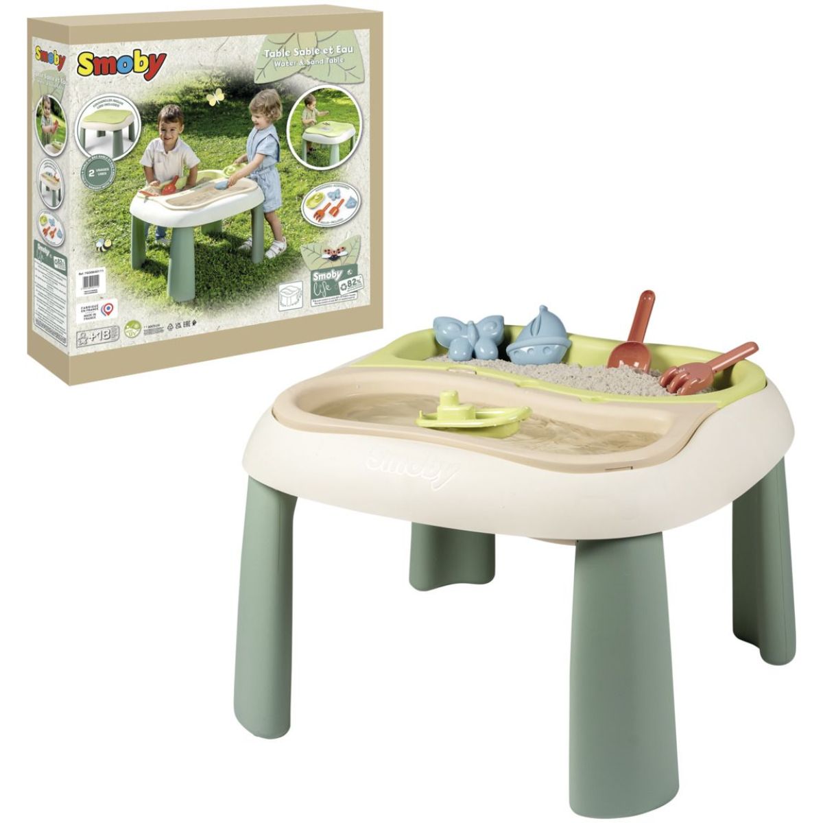 Plastové díly jsou ošetřeny anti-UV úpravou, takže barvy zůstávají dlouhodobě svěží a odolné vůči povětrnostním vlivům. Navíc je výrobek vyroben minimálně ze 83 % recyklovaného materiálu, což podporuje ekologický přístup k hračkám. Kompaktní rozměry 69 x 46 x 69 cm a nízká hmotnost kolem 4,5 kg dělají ze stolečku ideální doplněk pro malé i větší prostory.