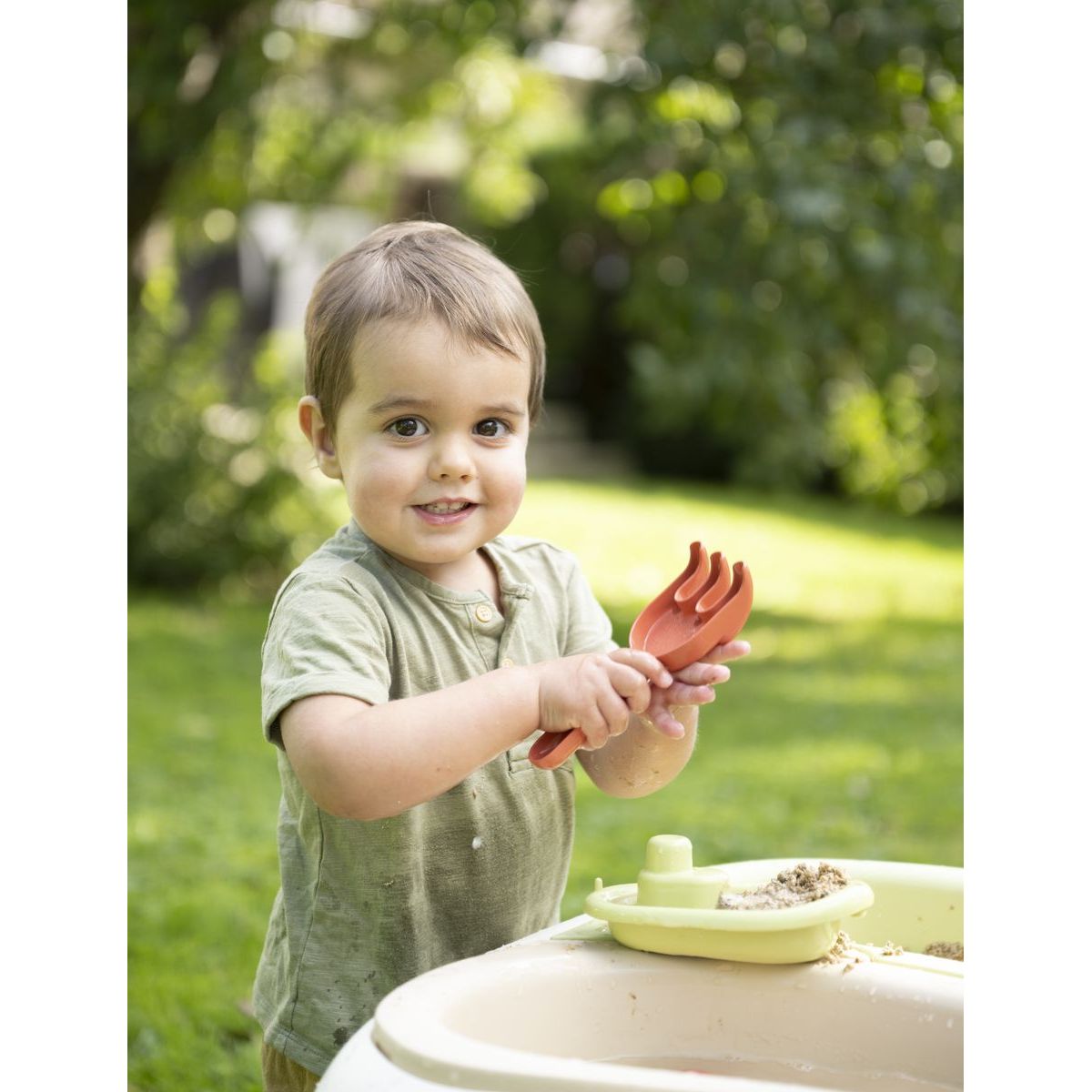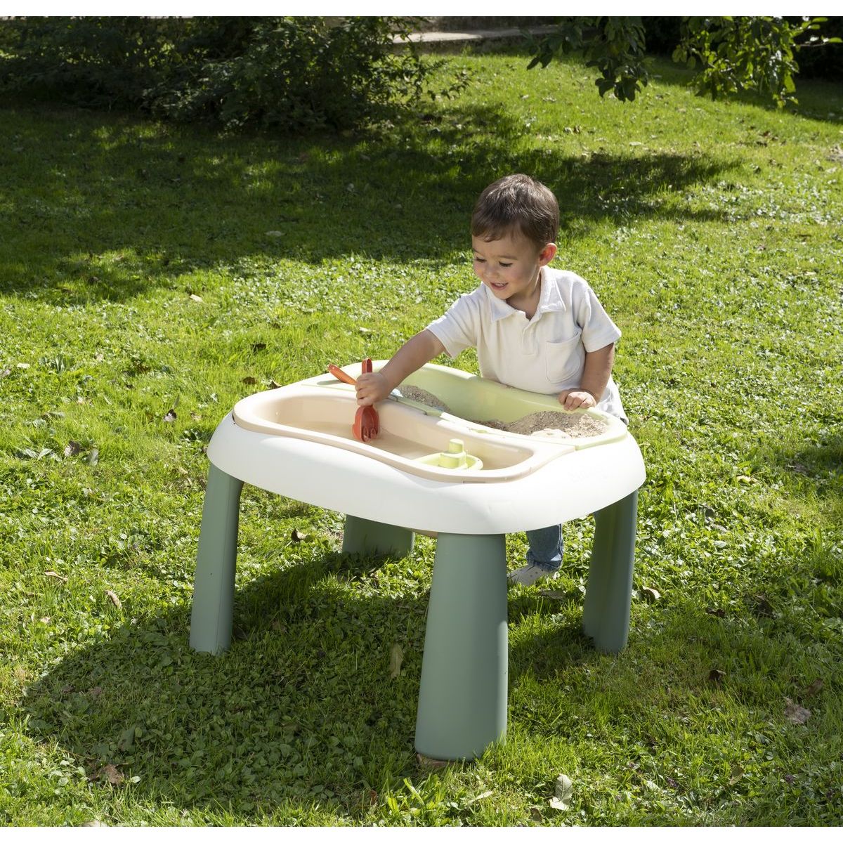 Tento robustní plastový stolek je vybaven dvěma vyjímatelnými boxy, které usnadňují manipulaci s pískem a vodou. Součástí balení jsou i hrabičky, lopatička, dvě formičky a malá lodička pro kreativní hraní. Ochranné víko ve dvou částech umožňuje snadné zakrytí obsahu stolu a ochranu před nečistotami. Díky otvoru uprostřed lze přidat slunečník (není součástí balení), což zpříjemní hry i během slunečných dní.